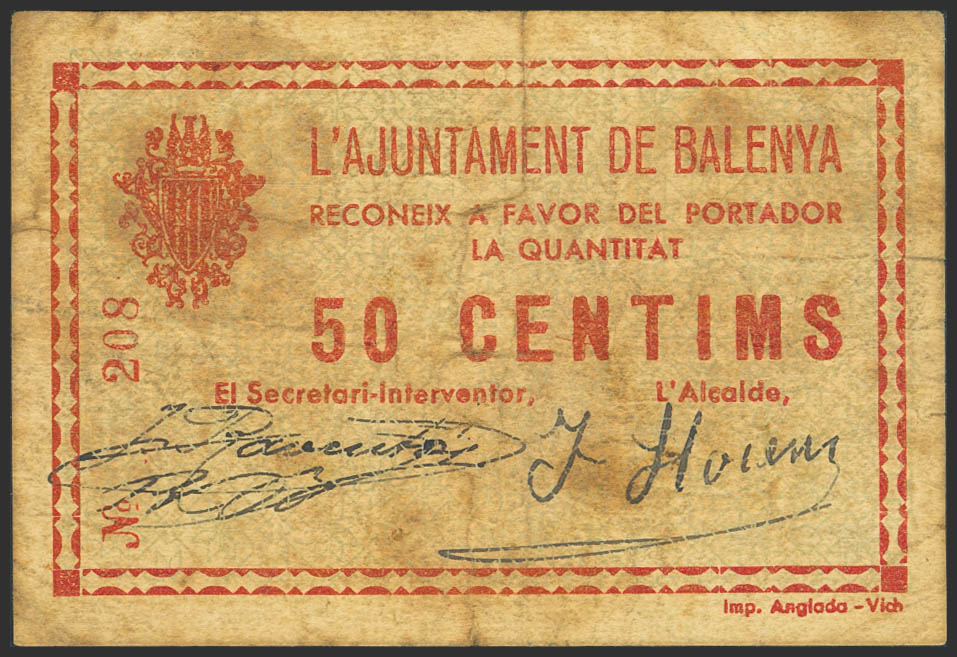 BALENYA (BARCELONA). 50 Céntimos. (1937ca). (González: 6493). Inusual. MBC.