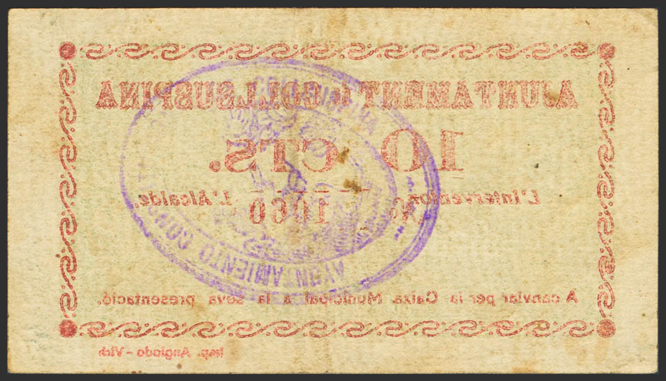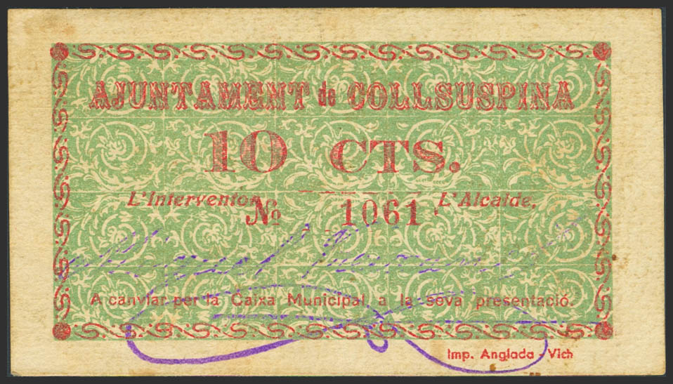 COLLSUSPINA (BARCELONA). 10 Céntimos. (1938ca). (González: 7645). Raro. MBC+.
