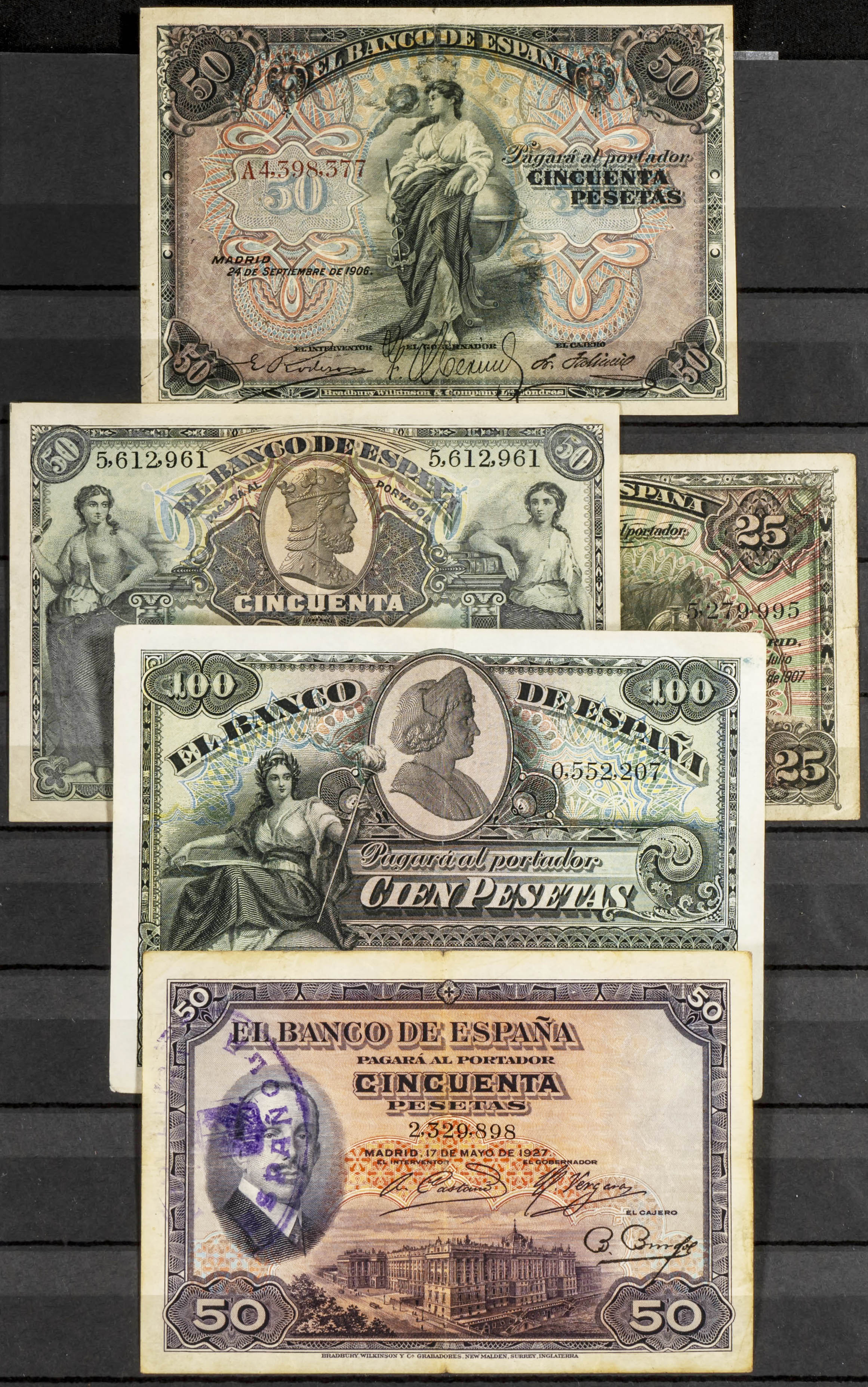 Conjunto de 5 billetes de las emisiones de 1906, 1907 y 1927. (Edifil 2023: 315, 318, 319, 320, 332), en diversas calidades. A EXAMINAR.