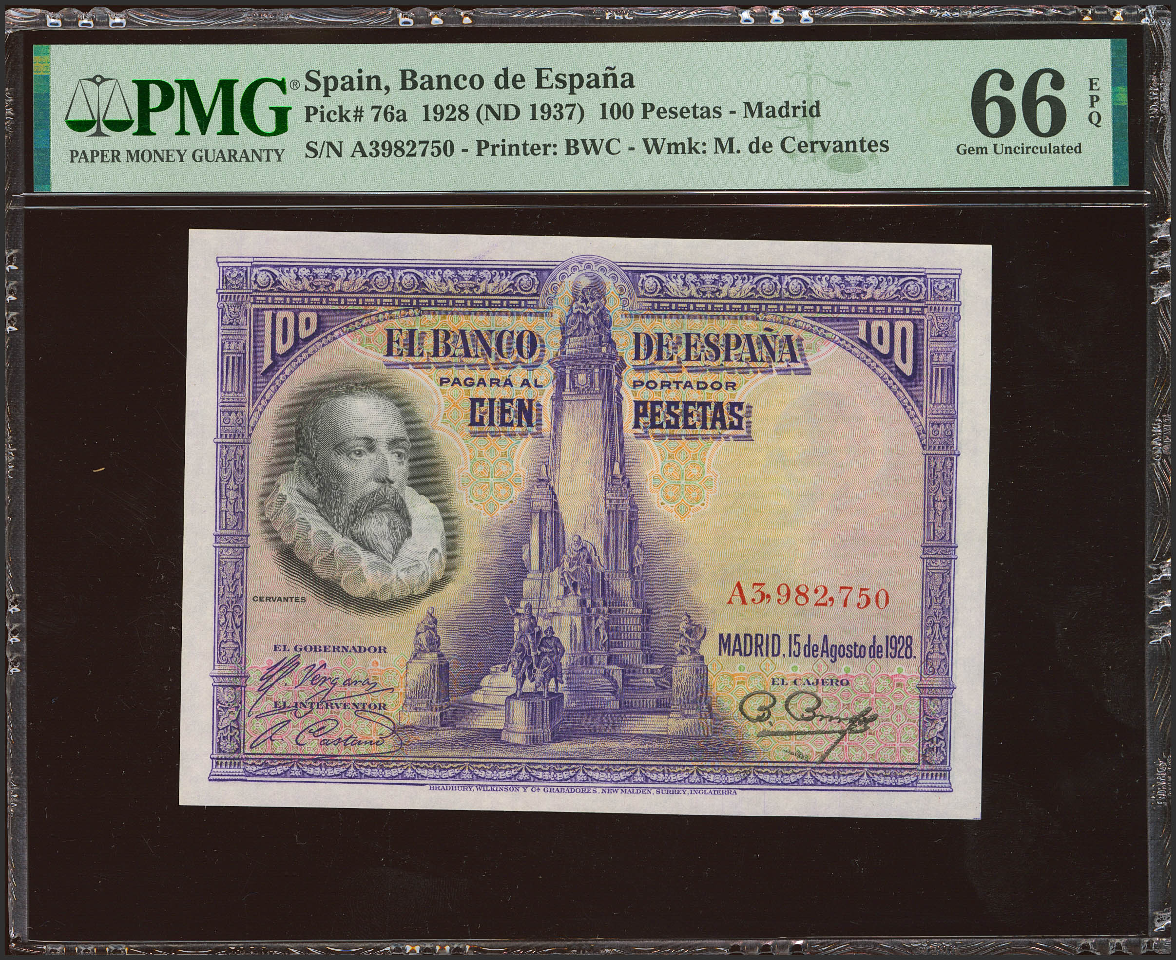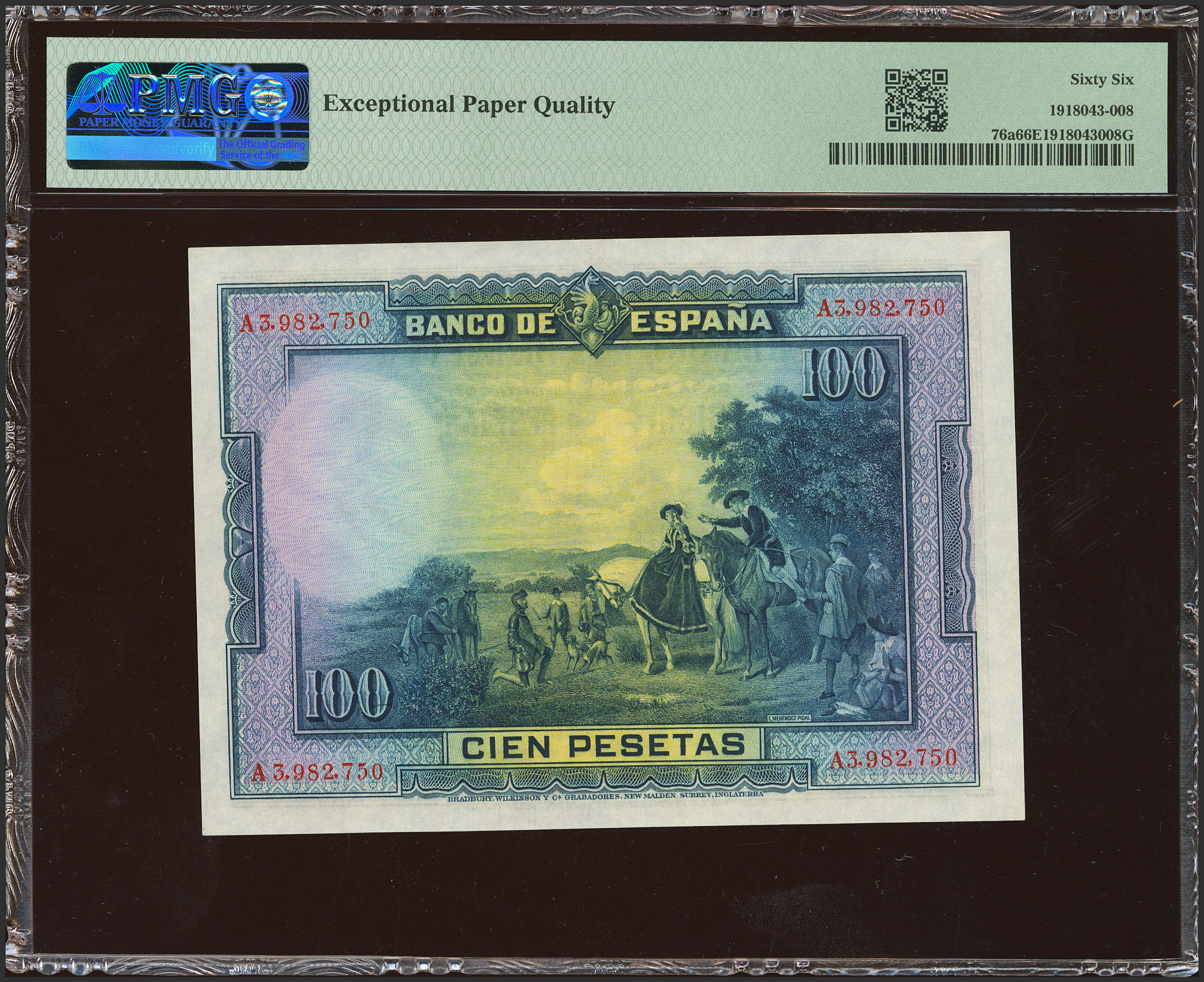 100 Pesetas. 15 de Agosto de 1928. Serie A. (Edifil 2023: 355a, Pick: 76a). Raro en esta excepcional calidad, apresto original. SC. Encapsulado PMG66EPQ.