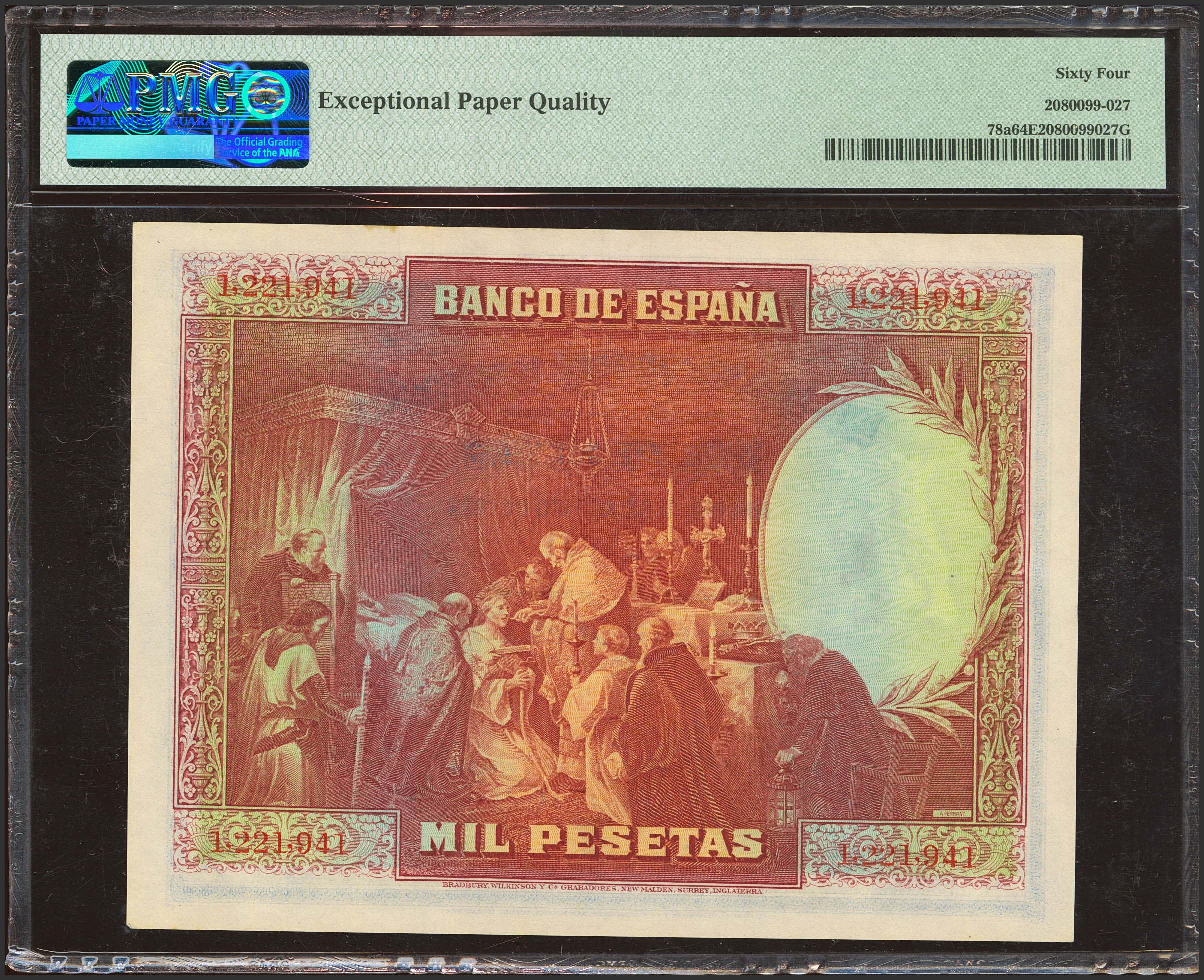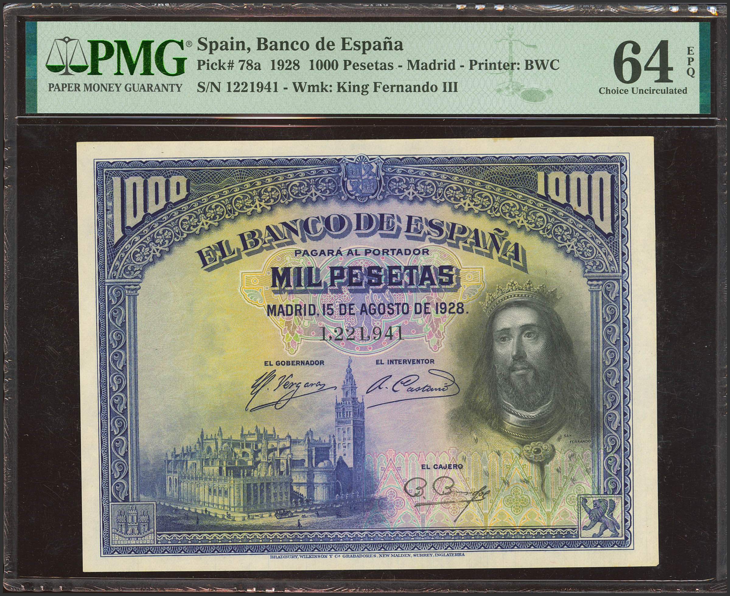 1000 Pesetas. 15 de Agosto de 1928. Sin serie. (Edifil 2021: 357, Pick: 78a). Inusual, apresto original. SC. Encapsulado PMG64EPQ.