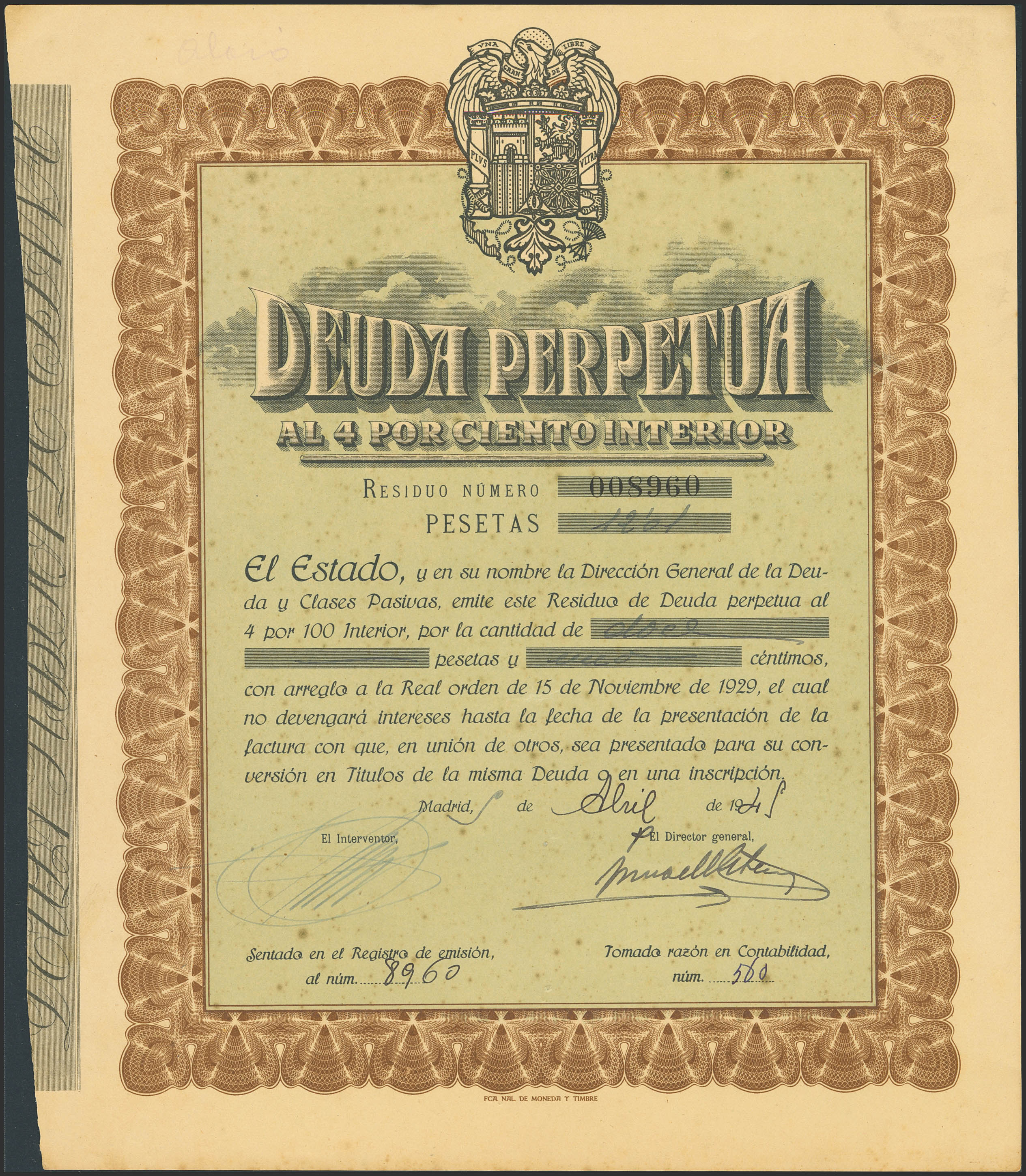 12´01 Pesetas. Deuda Perpetua al 4% Interior. 15 de Noviembre de 1949. Puntitos del tiempo. SC--.