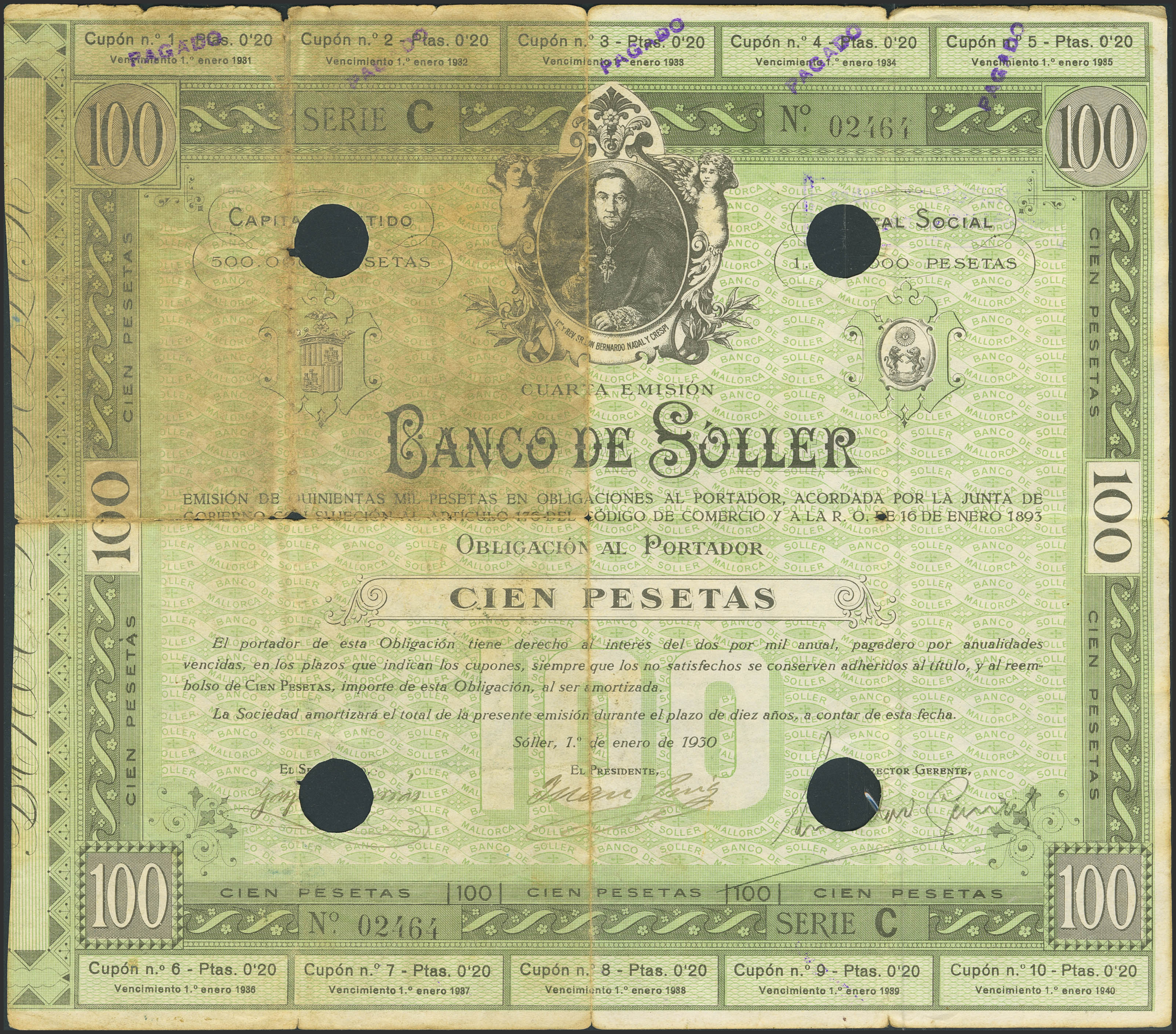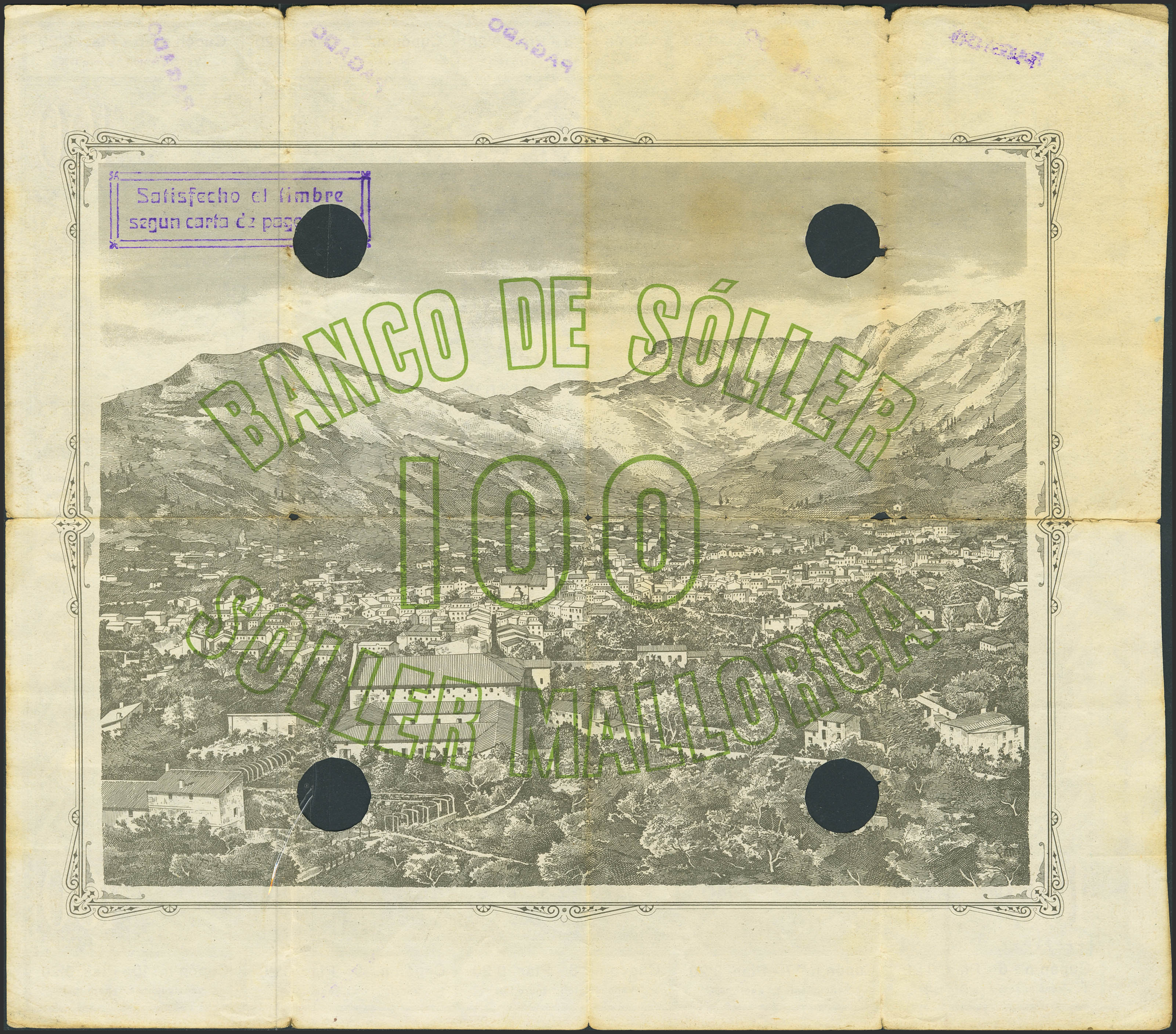 100 Pesetas. 1 de Enero de 1930. Banco de Soller. Serie C, cuarta emisión y taladradro. Para entender mejor la contextualización de este billete recomendamos la obra "Obligaciones, vales y documentos puestos en circulación como papel moneda en España", de Don Ramón Cobo Huici. Raro verdaderamente circulado. MBC-.
