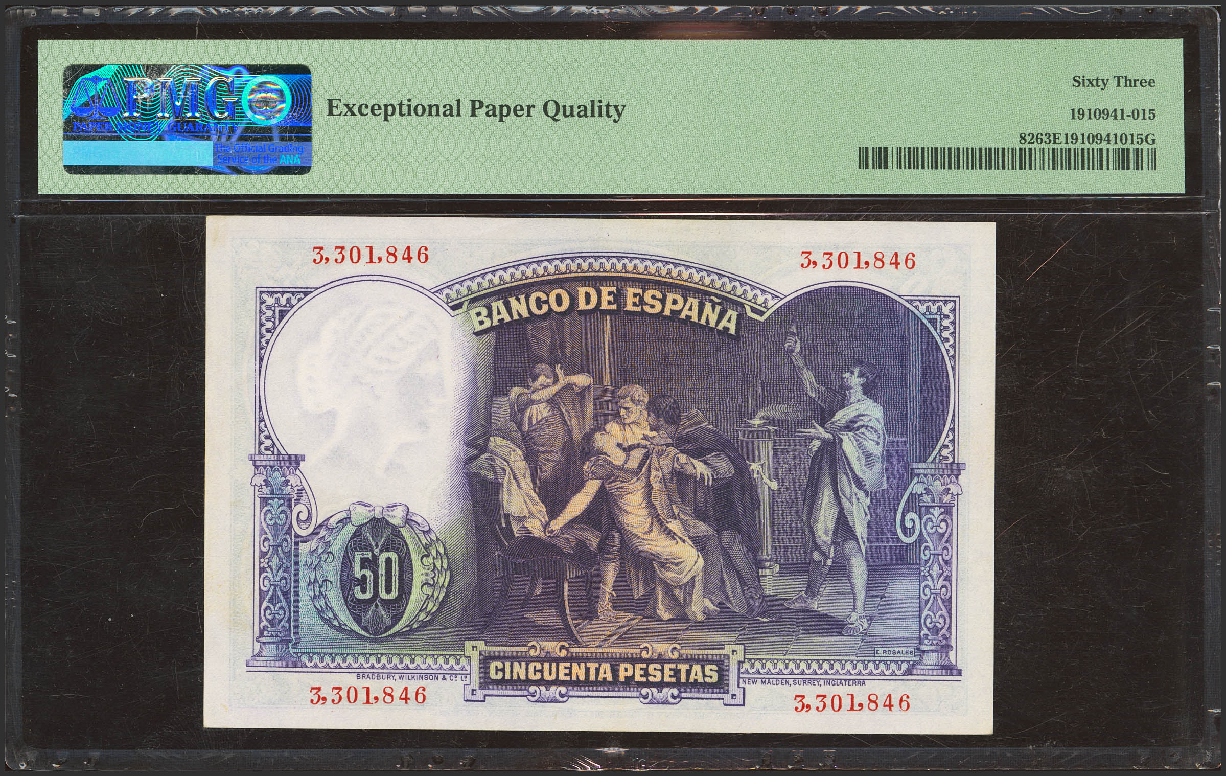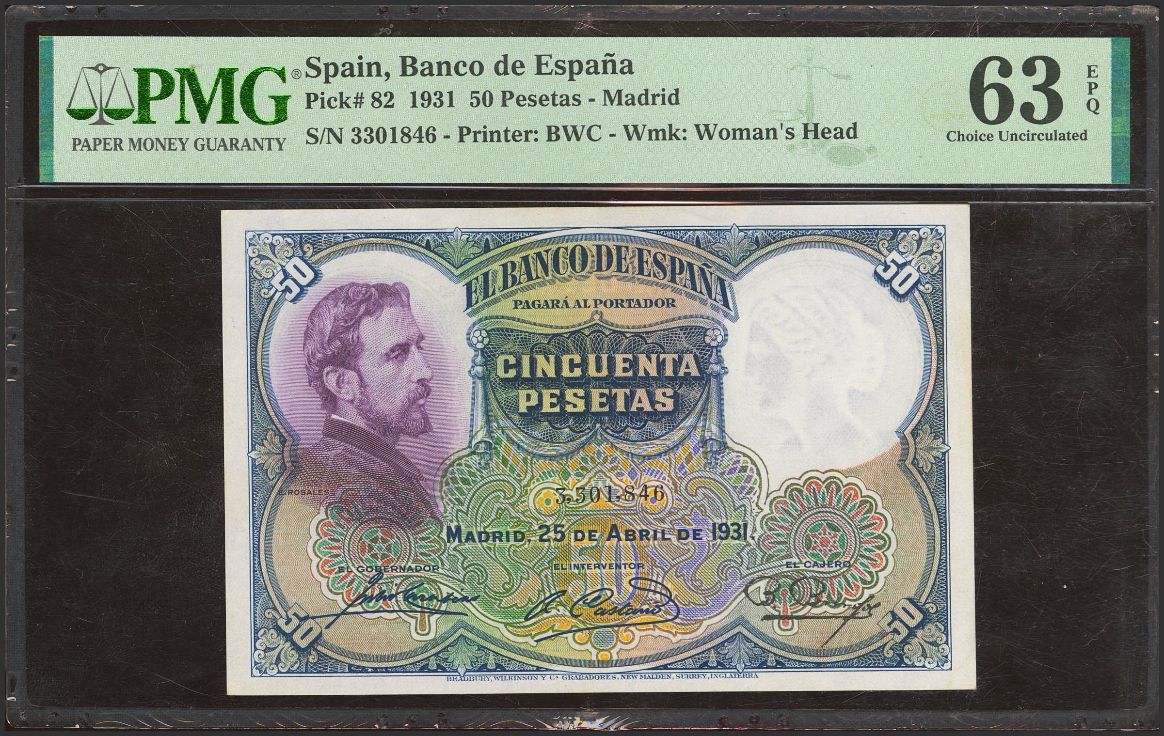 50 Pesetas. 25 de Abril de 1931. Sin serie. (Edifil 2023: 359, Pick: 82). Apresto original. SC. Encapsulado PMG63EPQ.
