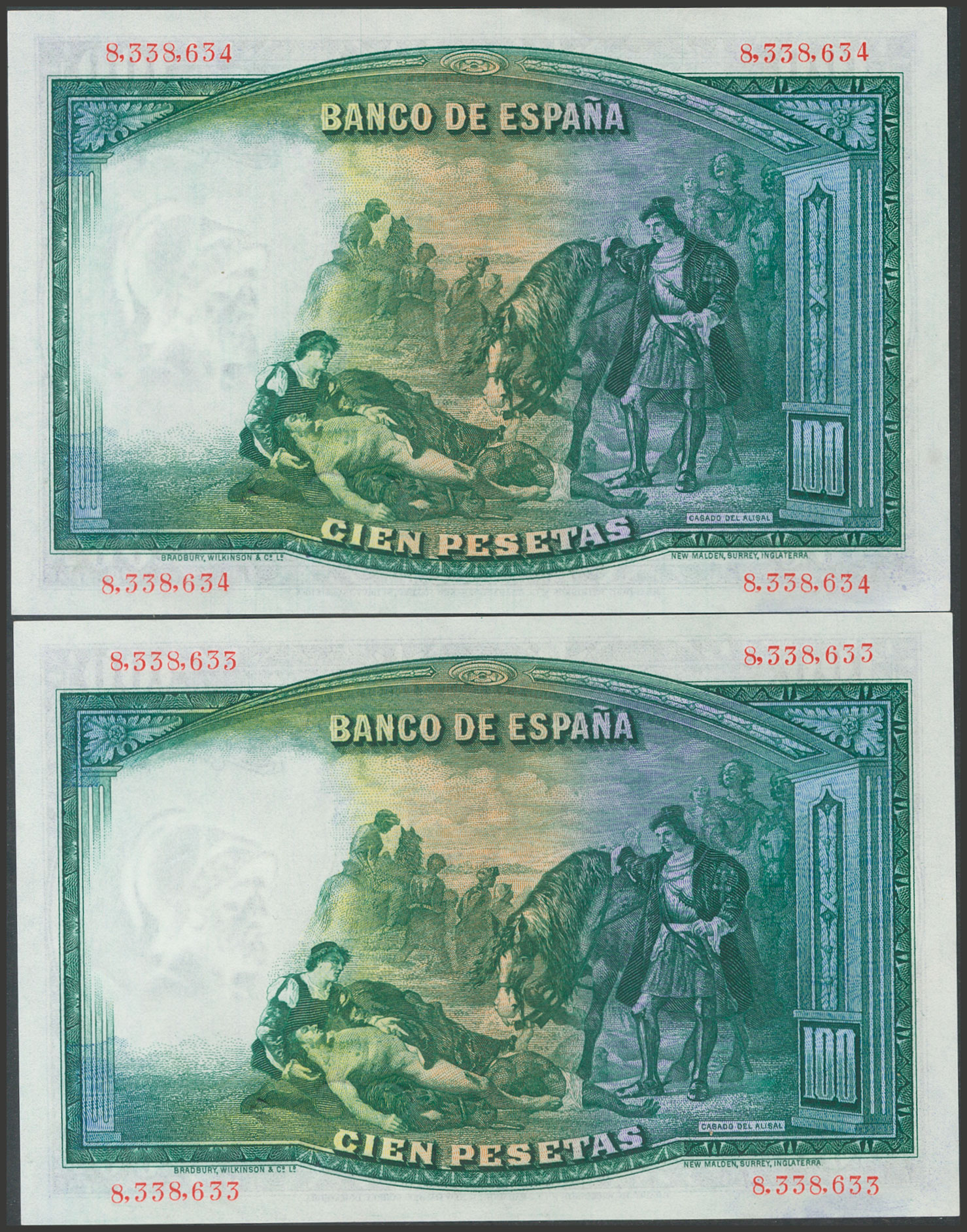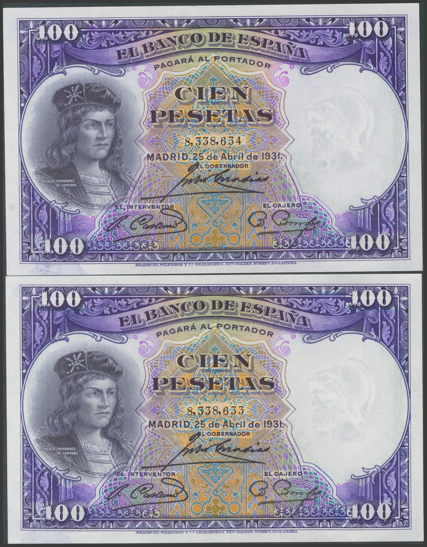 100 Pesetas. 25 de Abril de 1931. Pareja correlativa. Sin serie. (Edifil 2017: 360). Conserva todo su apresto original. SC-.