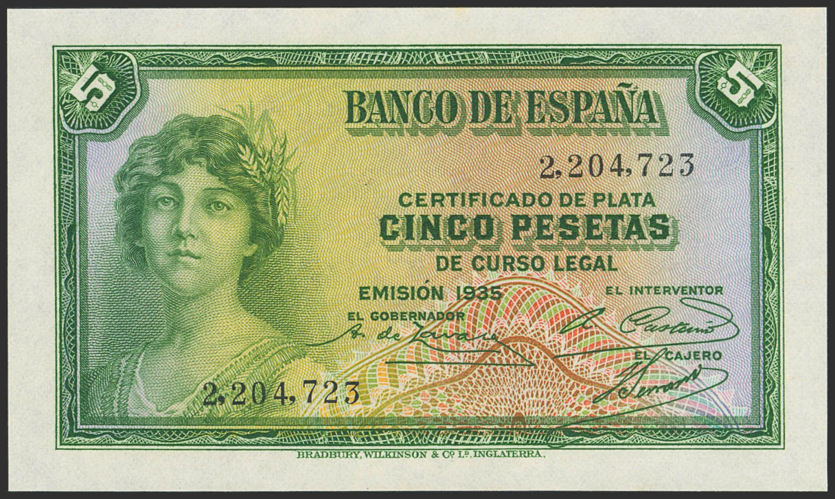 5 Pesetas. 1935. Certificado de Plata. Sin serie. (Edifil 2023: 363). Conserva todo su apresto original. SC.