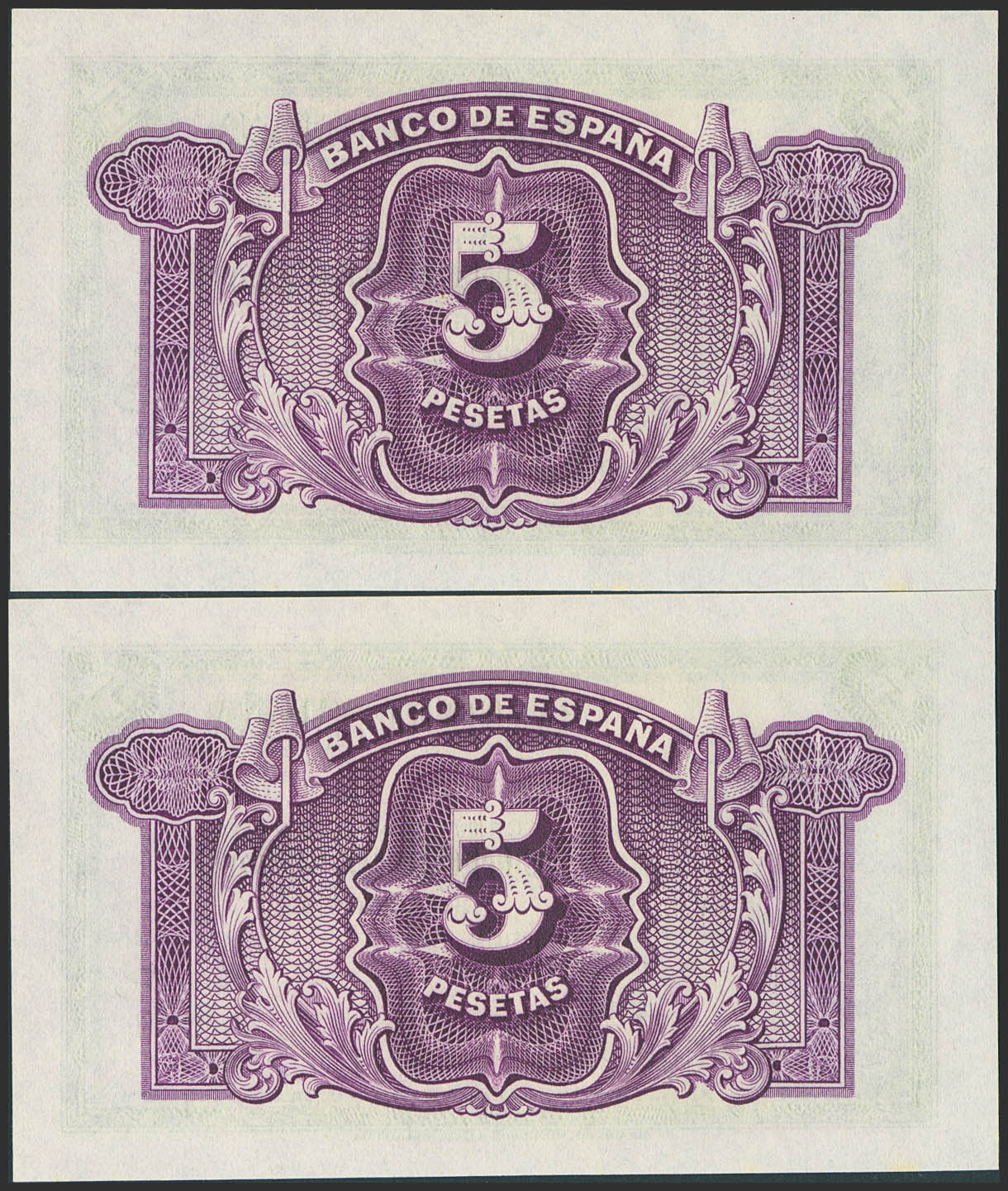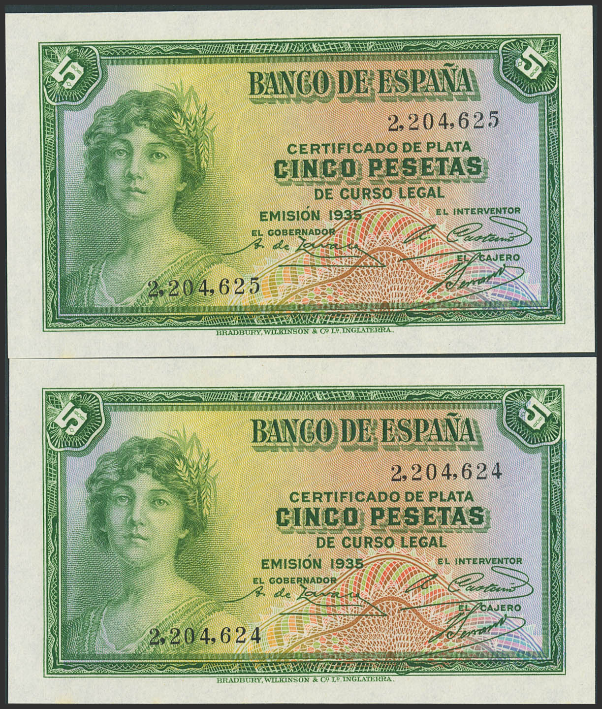 5 Pesetas. 1935. Pareja correlativa. Certificado de Plata. Sin serie. (Edifil 2023: 363). Conserva todo su apresto original. SC.