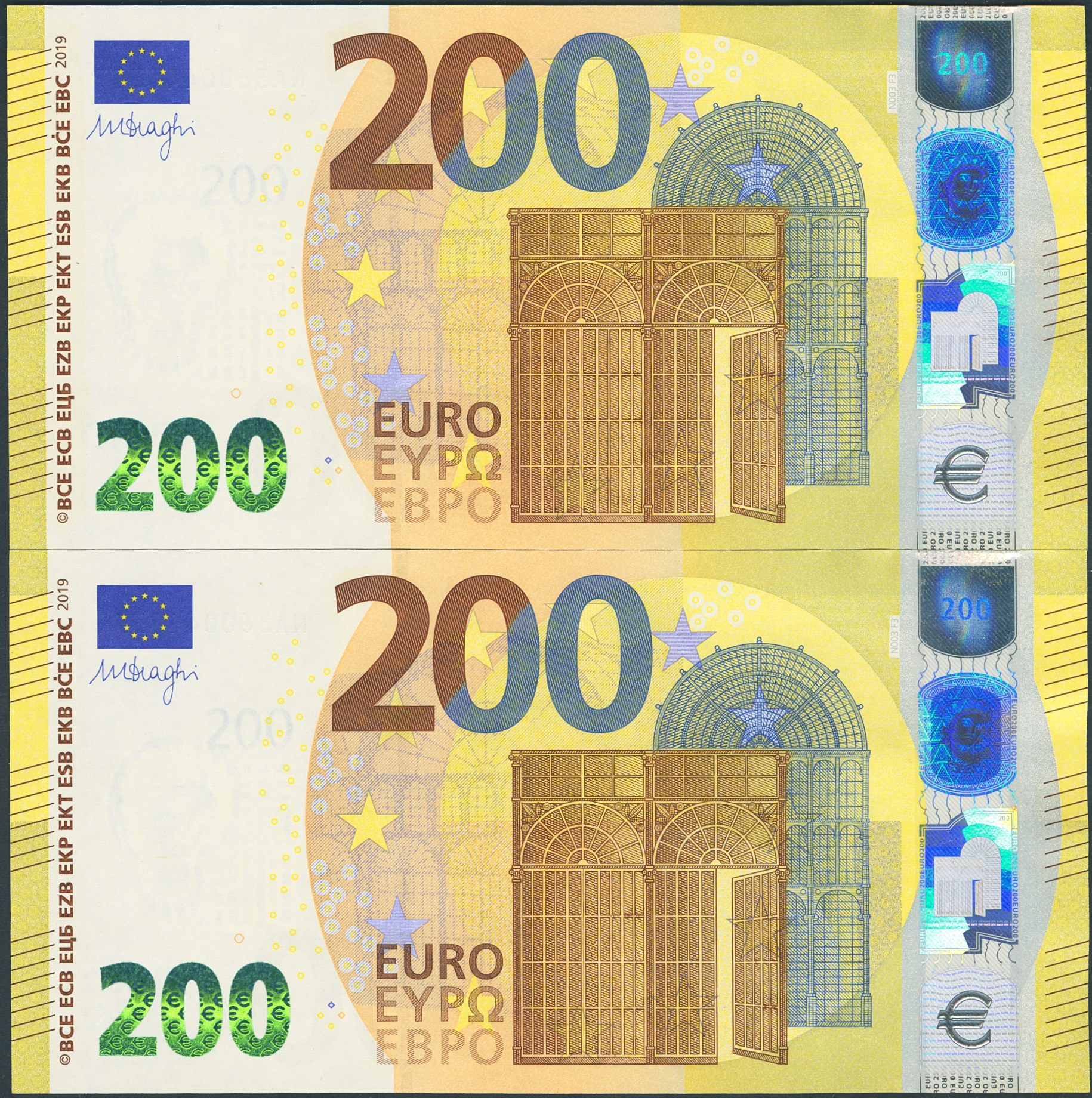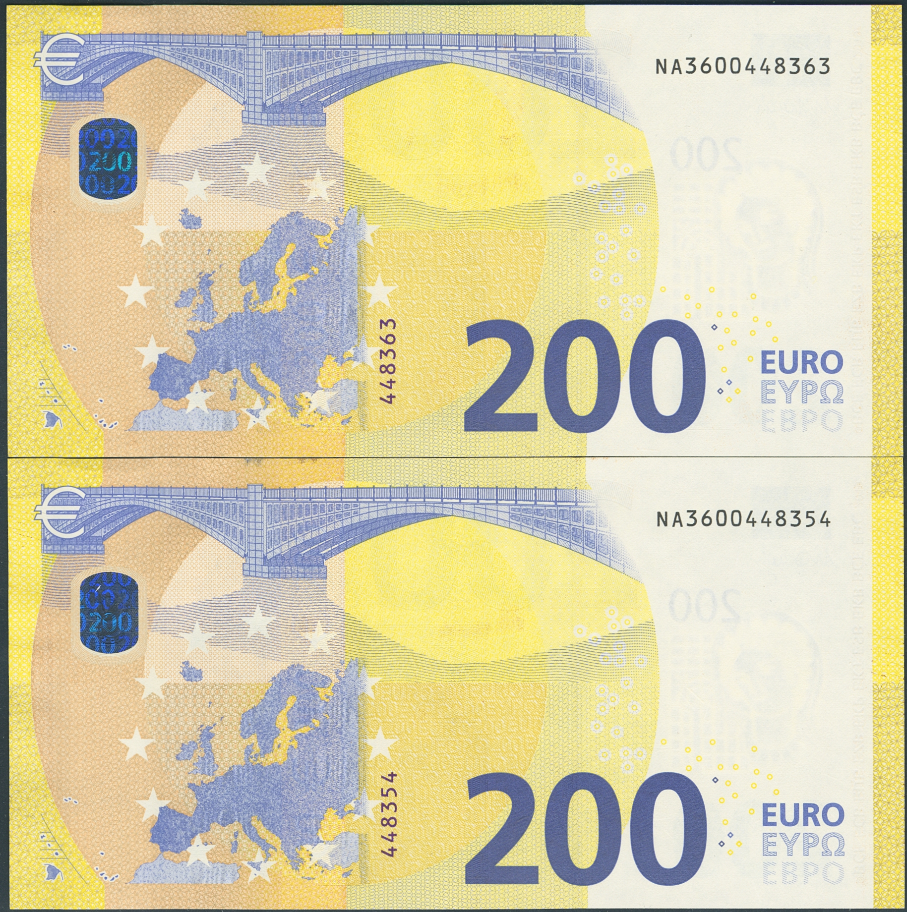 AUSTRIA. 200 Euros. Correlative pair (it should be recalled that the last digit of the numbering of all euro banknotes is for the internal control of the European Central Bank, the penultimate digit being the one that marks the correlativity of the banknotes). 2015. Signature Draghi. Serial N (Austria). (Pick: Unlisted). Uncirculated.