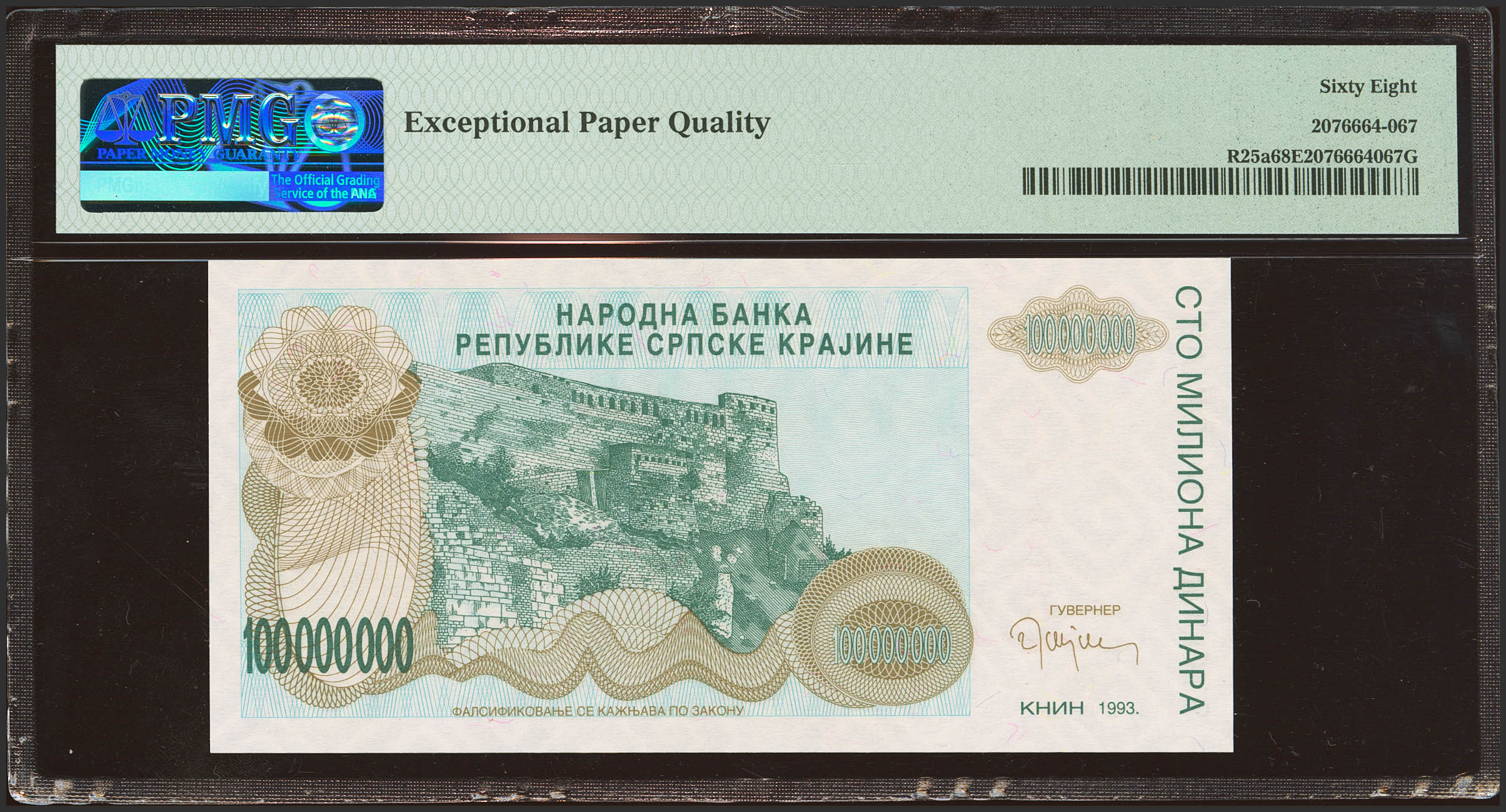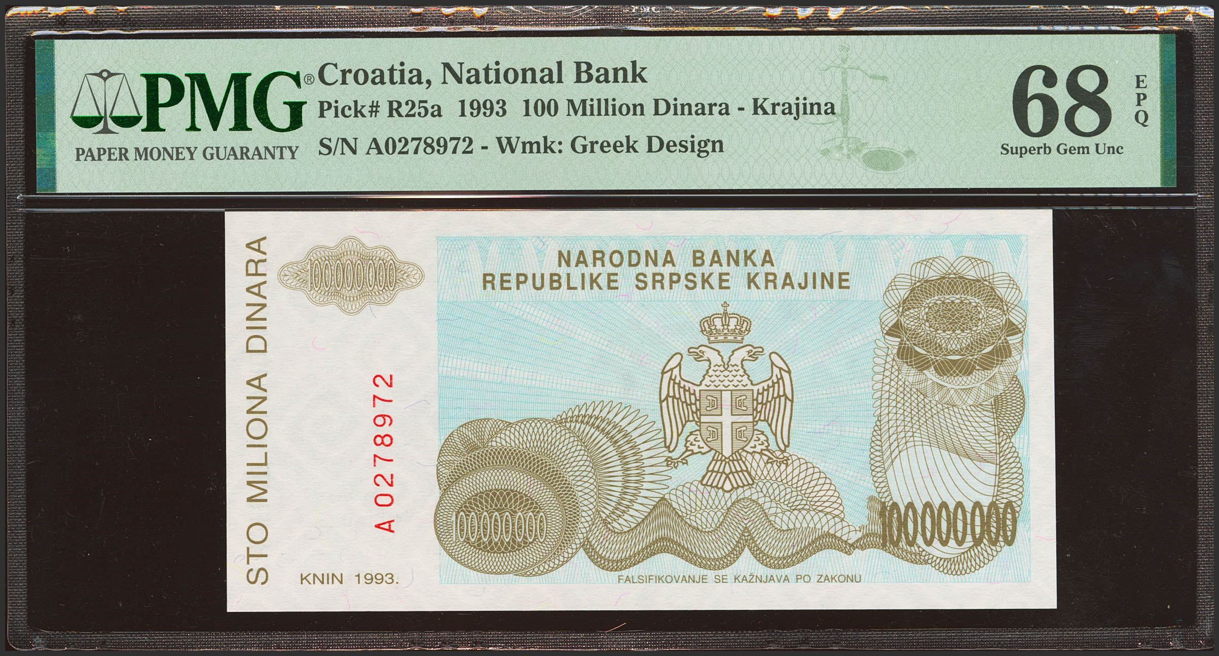 CROATIA. 100 Million Dinara. 1993. (Pick: R25a). PMG68EPQ (according to the PMG population report, it is the Top Pop banknote as of 15 January 2025).
