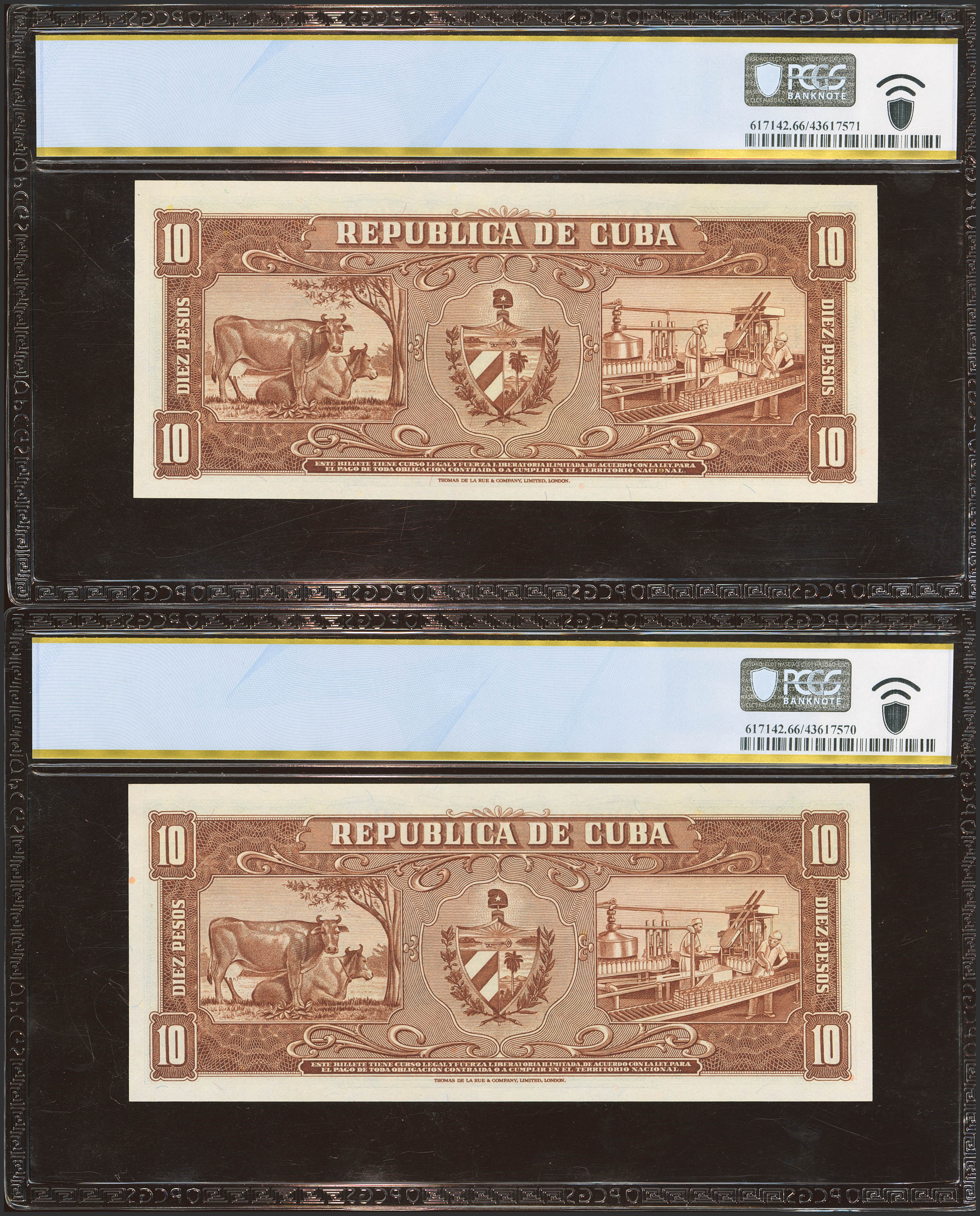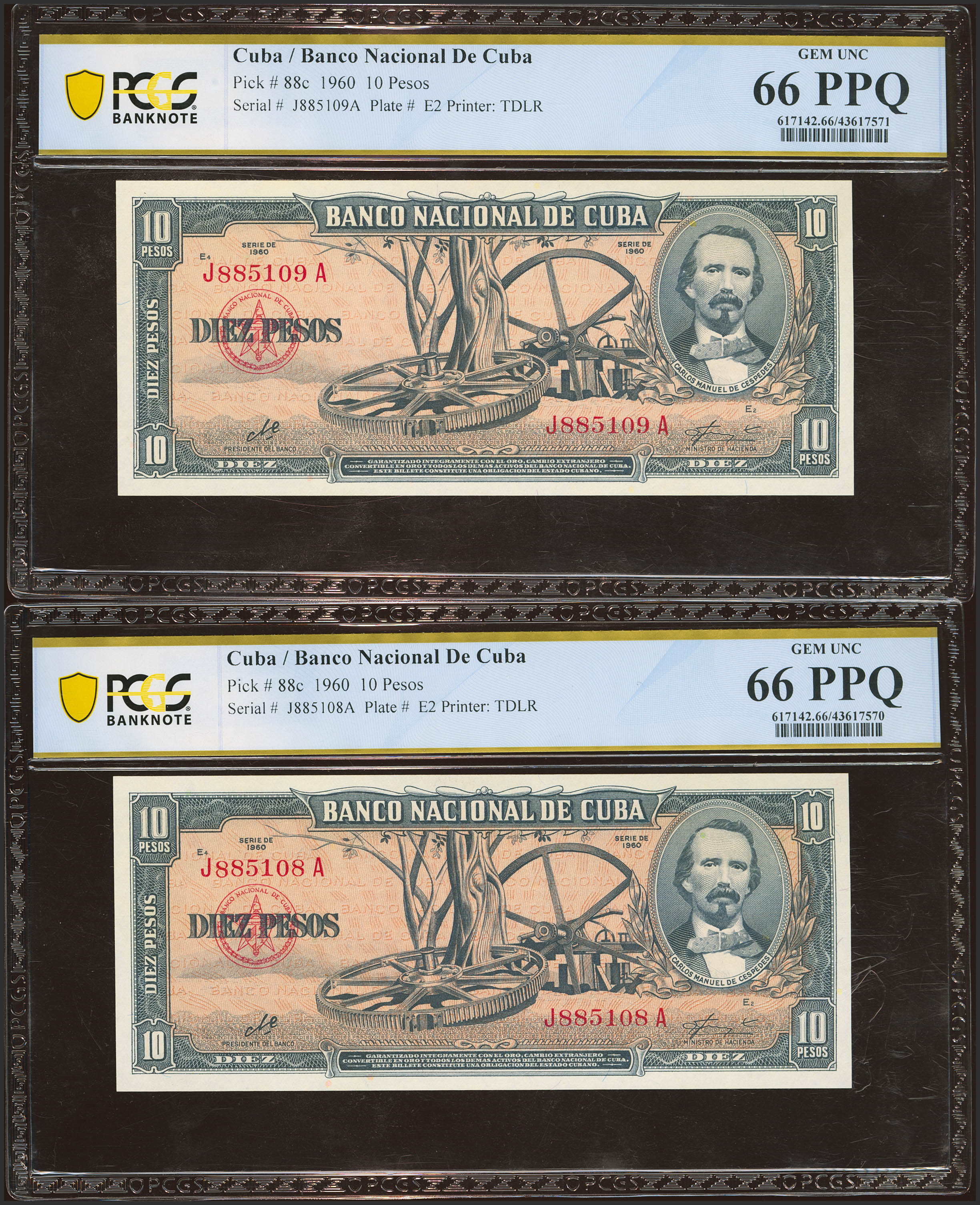 CUBA. 10 Pesos. 1960. Correlative pair. (Pick: 88c). PCGS66PPQ, both.