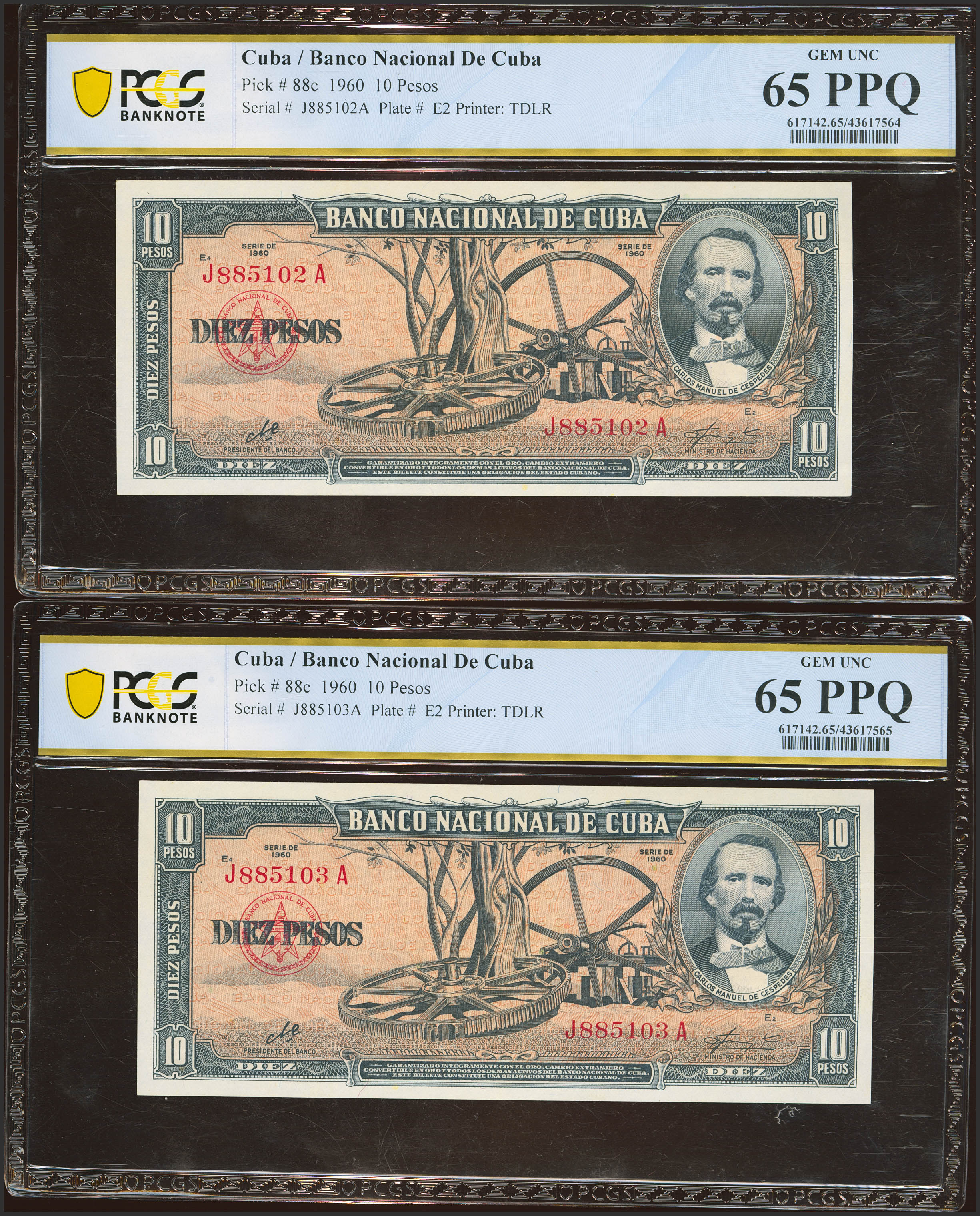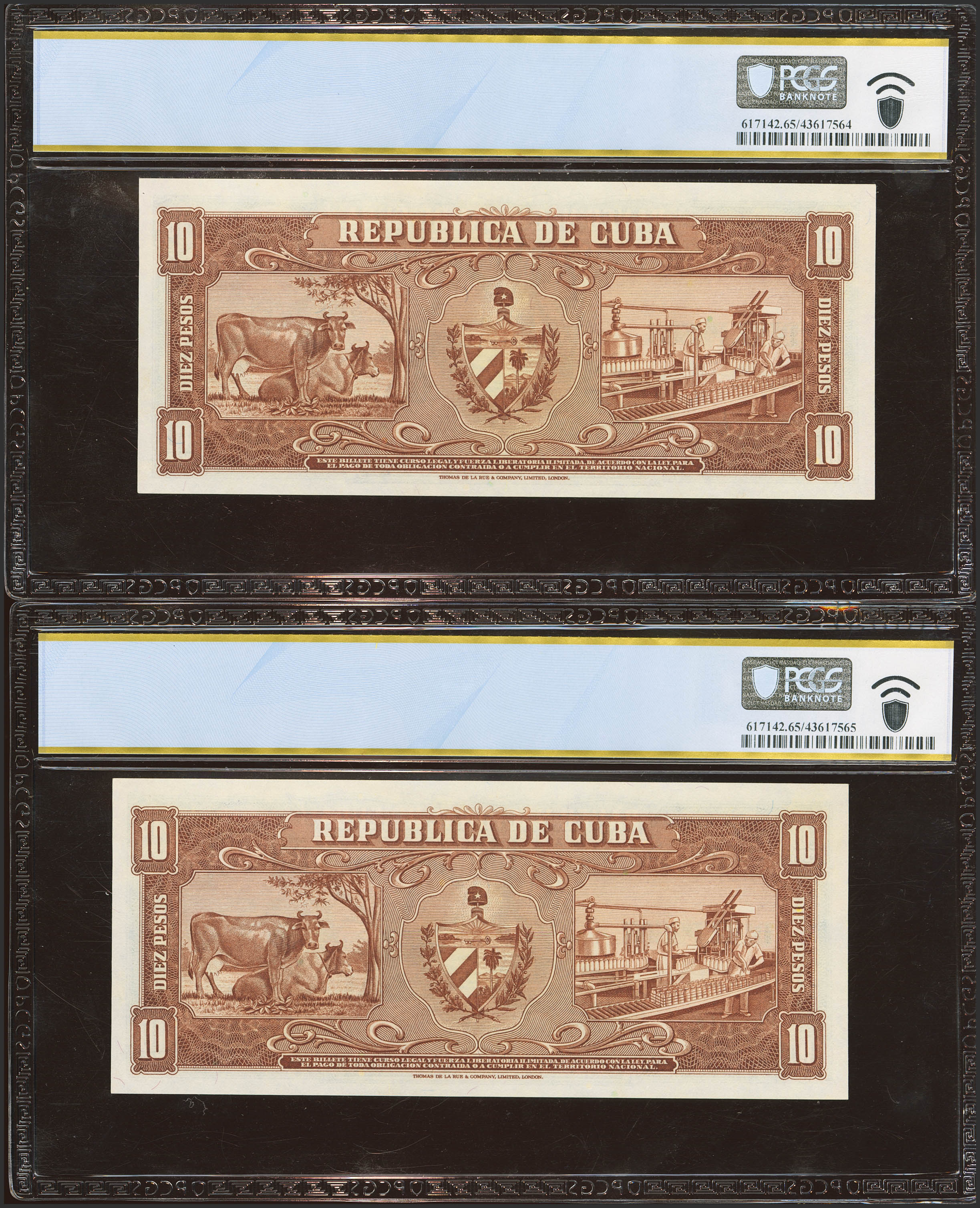 CUBA. 10 Pesos. 1960. Correlative pair. (Pick: 88c). PCGS65PPQ, both.