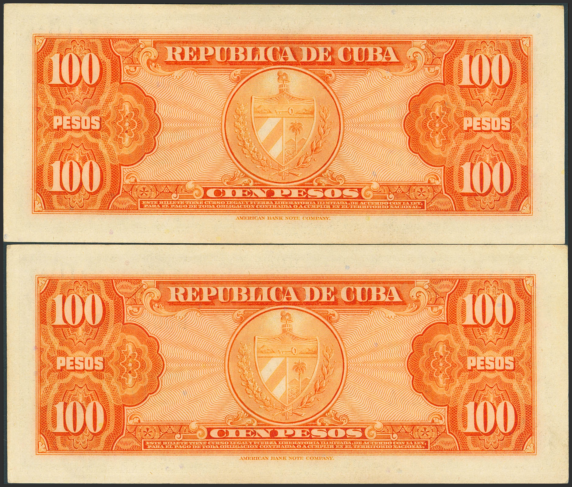CUBA. 100 Pesos. 1959. Correlative pair. Low numeration. (Pick: 93). Less than Uncirculated.