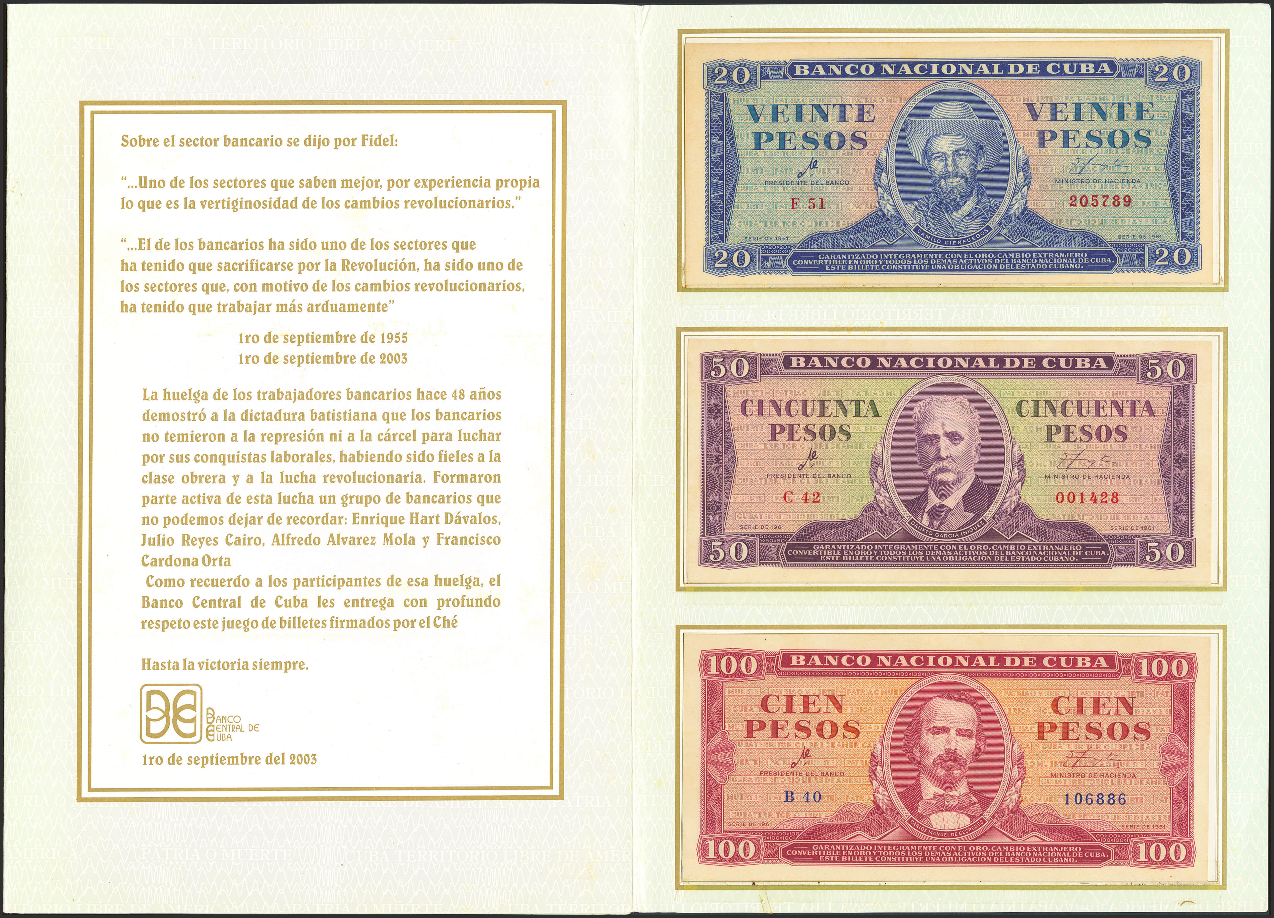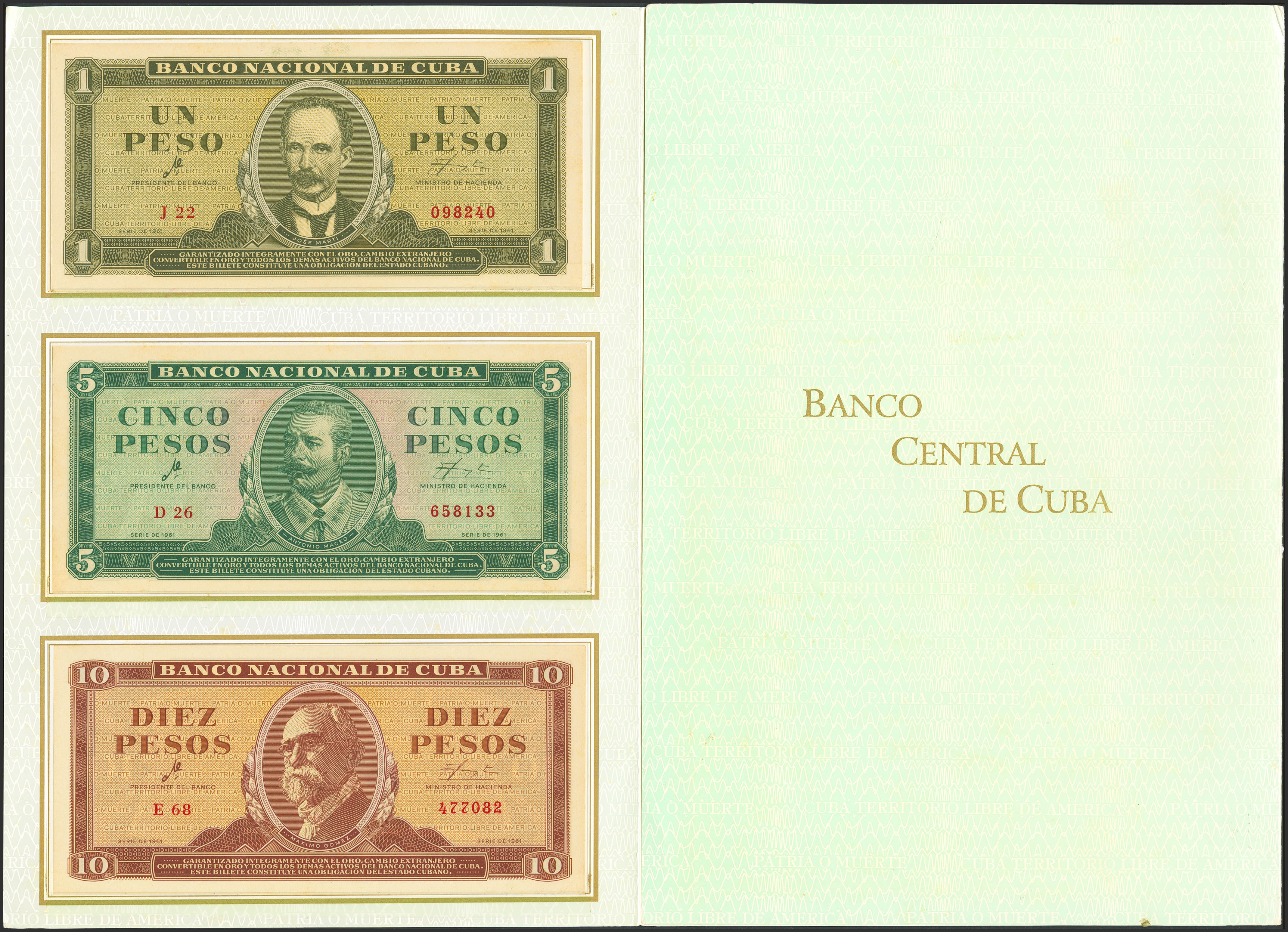 Complete serie of Cuba. 1 Peso, 5 Pesos, 10 Pesos, 20 Pesos, 50 Pesos and 100 Pesos. 1961. Presentation folder (this folder was only given to the top management of the Cuban banking sector). (Pick: 94A, 95A, 96A, 97A, 98A, 99A). Less than Uncirculated.