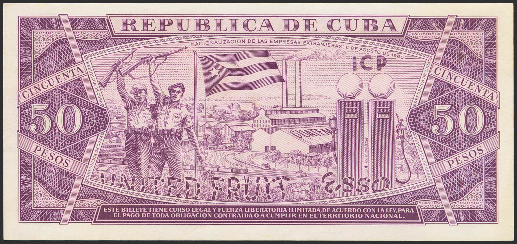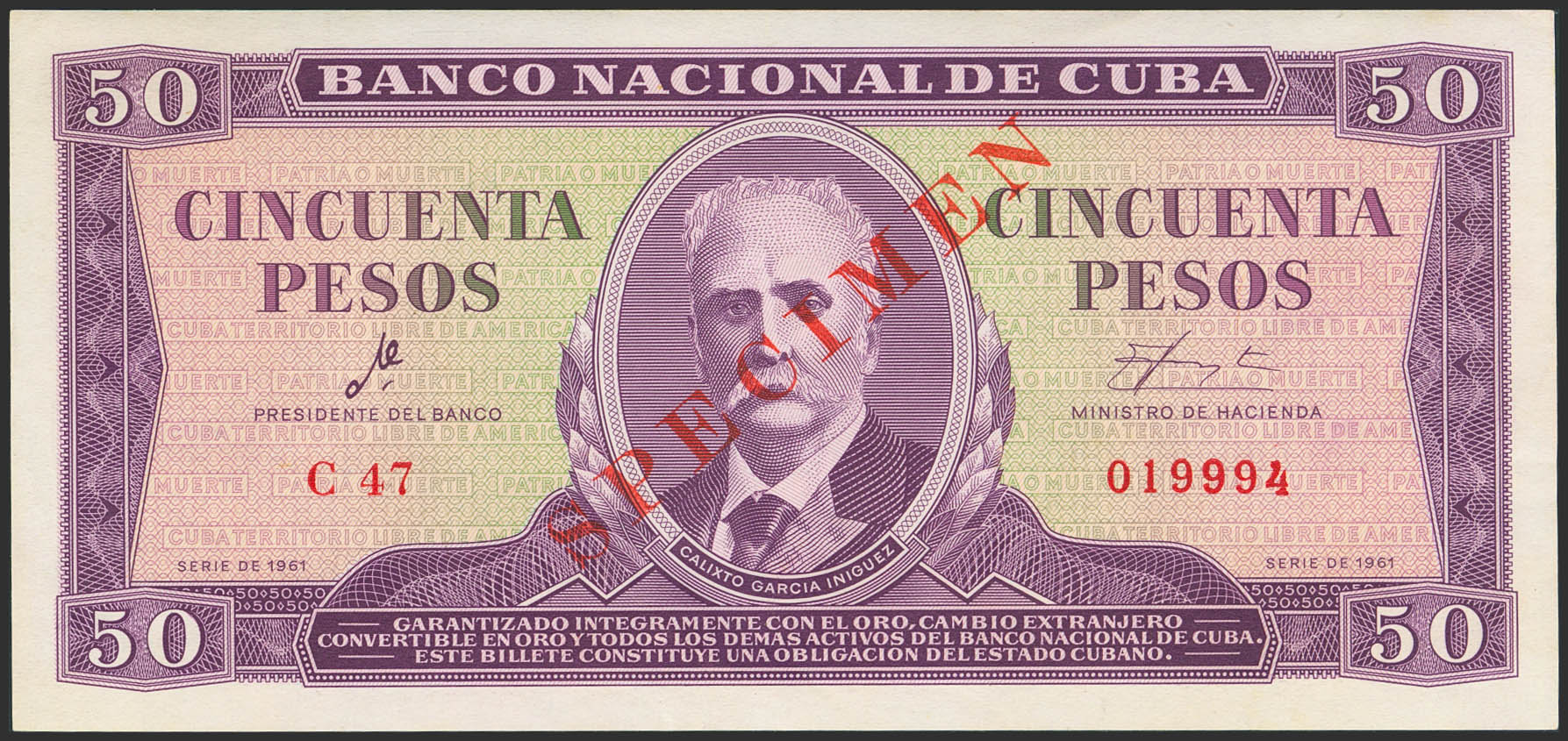 CUBA. 50 Pesos. 1961. SPECIMEN. (Pick: 98s). Less than Uncirculated.