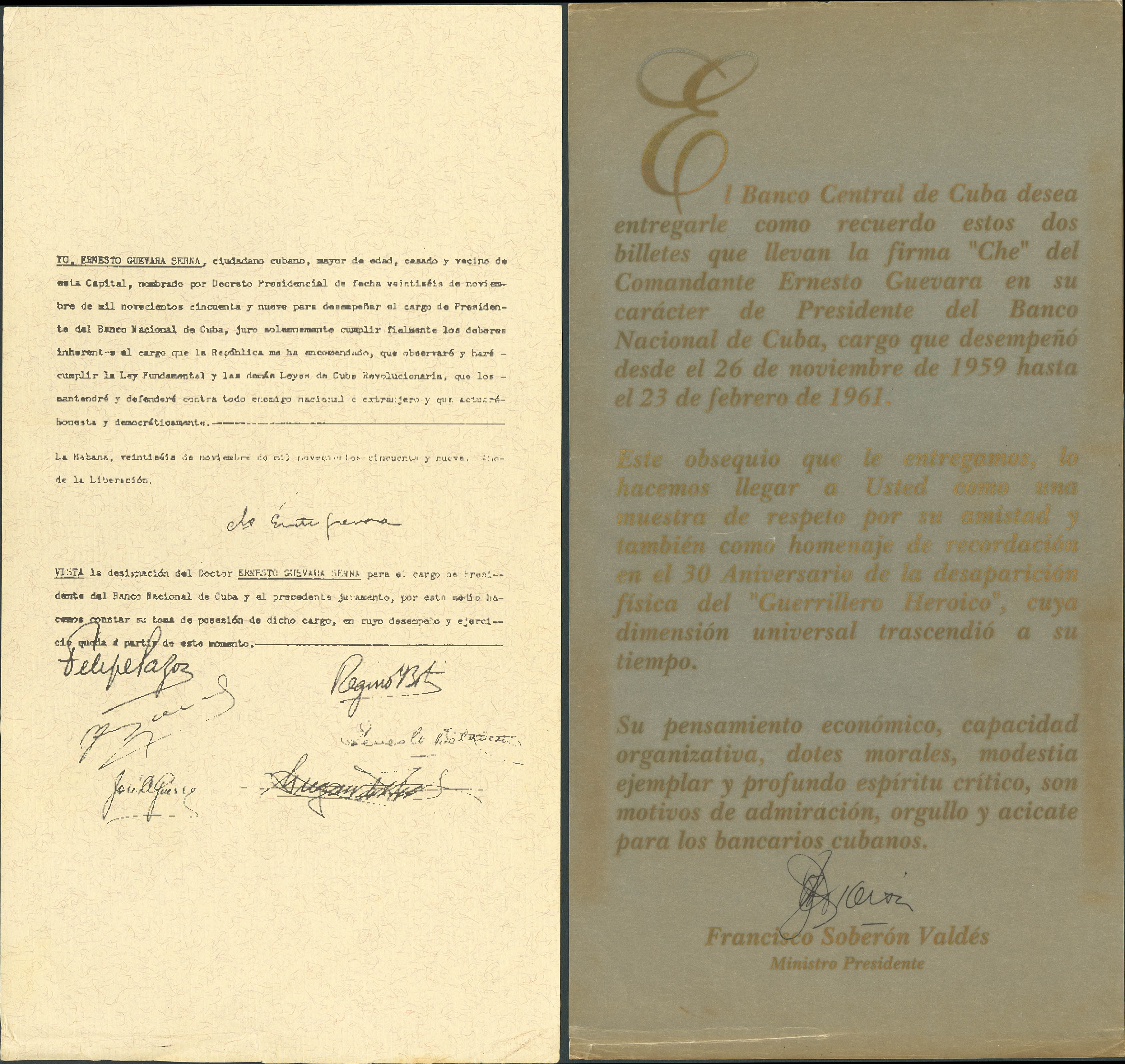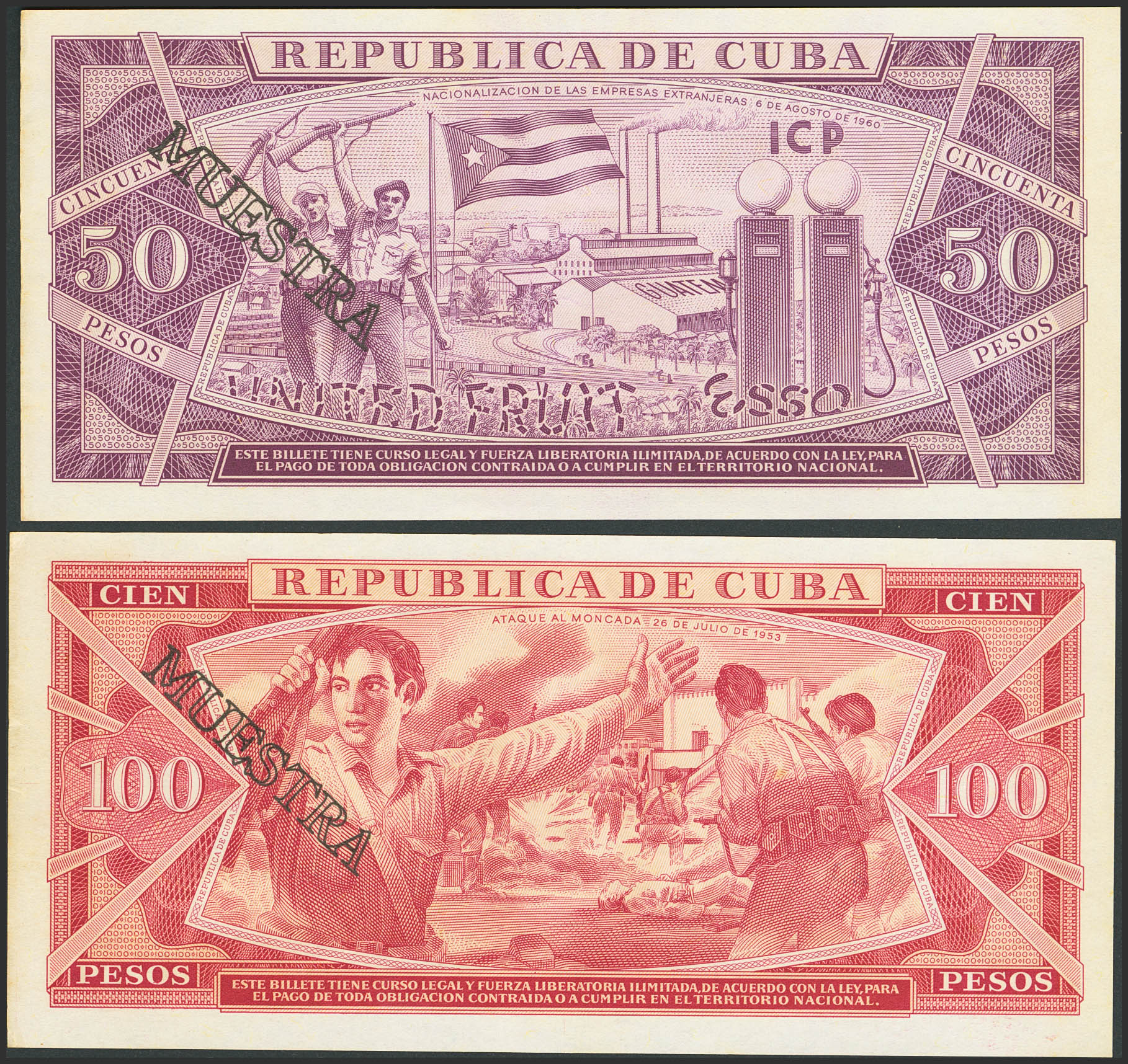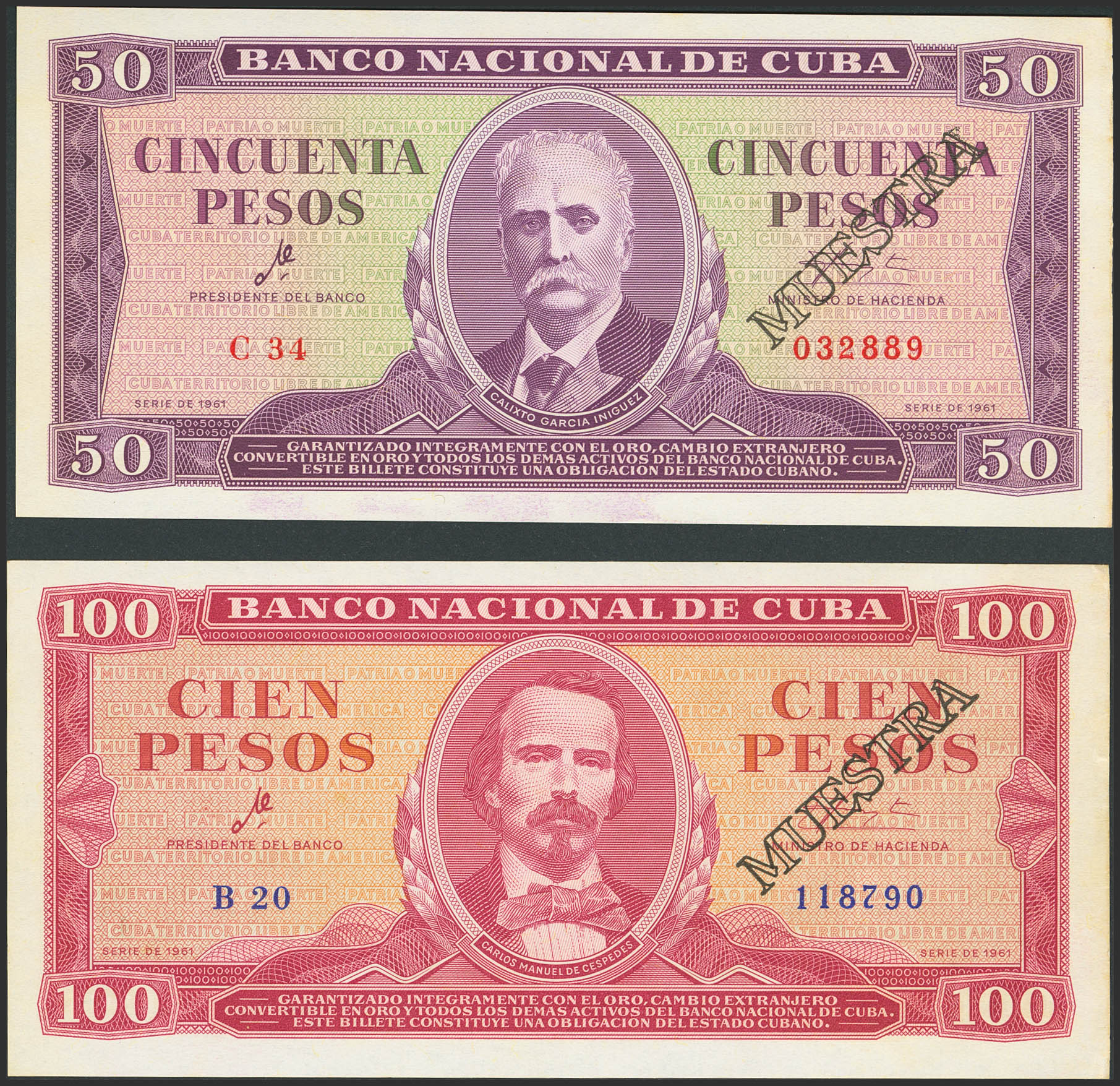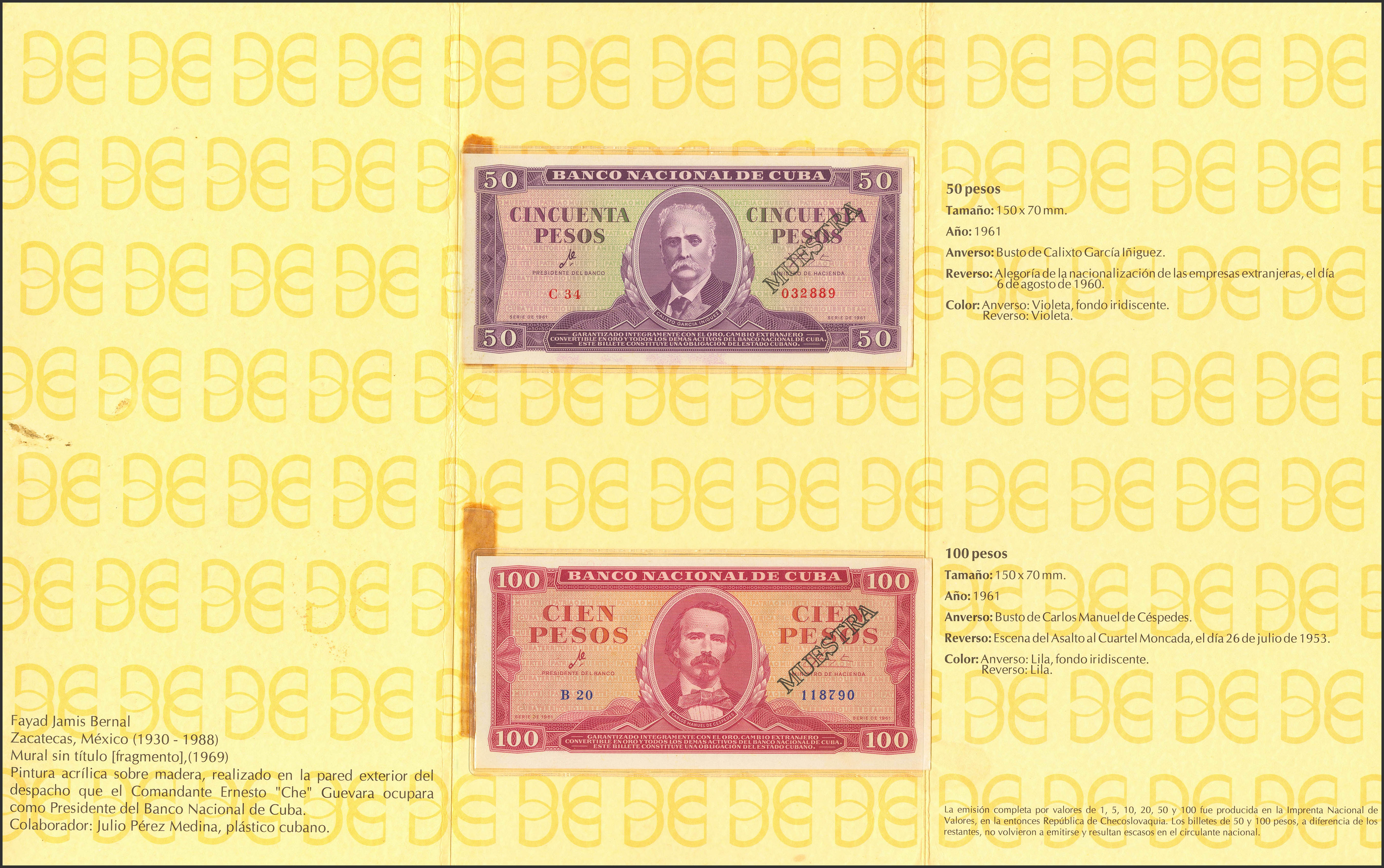 CUBA. 50 Pesos and 100 Pesos. 1961. SPECIMEN, in black. Presentation folder (this folder was only given to the top management of the Cuban banking sector, and it is accompanied by two fascimiles). (Pick: 98AS2, 99AS2). Extremely rare. Less than Uncirculated.
