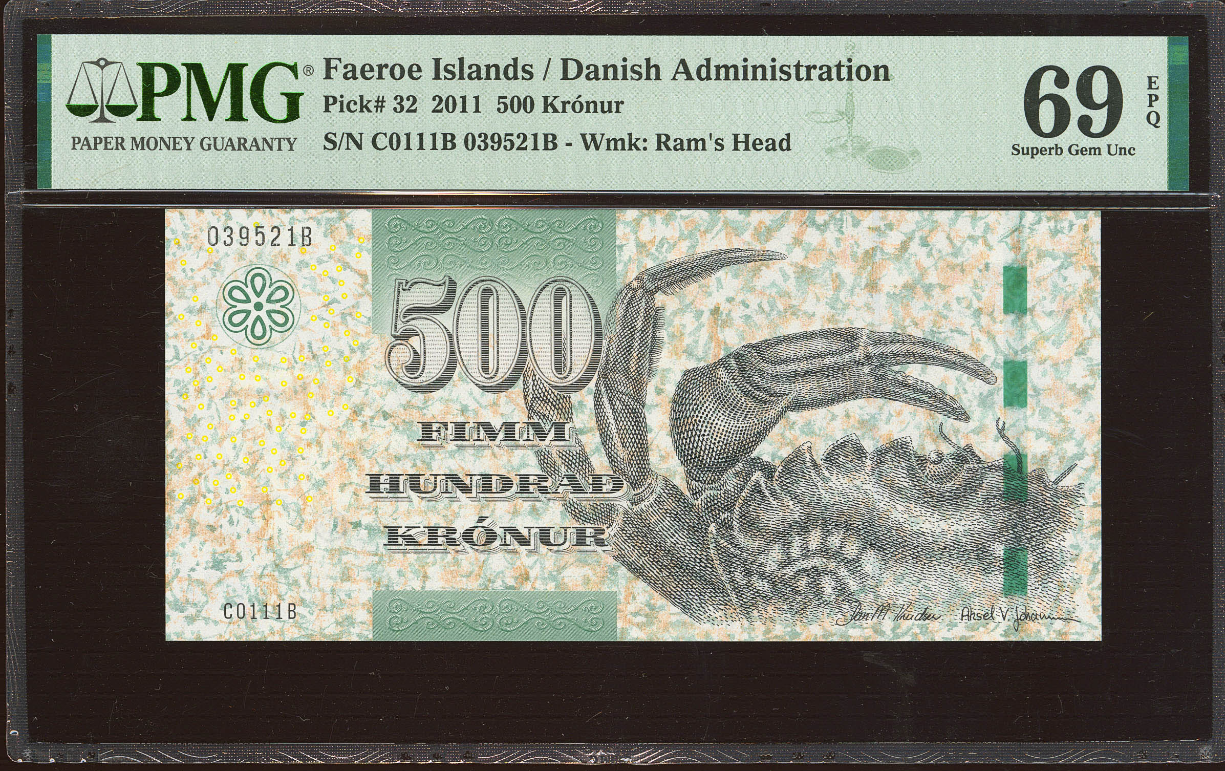 FAEROE ISLANDS. 500 Krónur. 2011. (Pick: 32). PMG69EPQ (including commercial brochure).