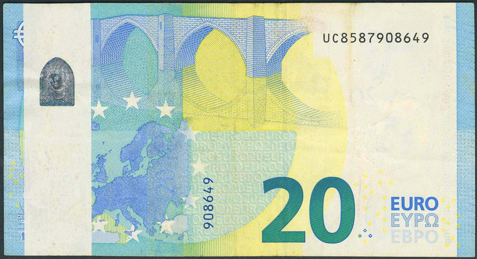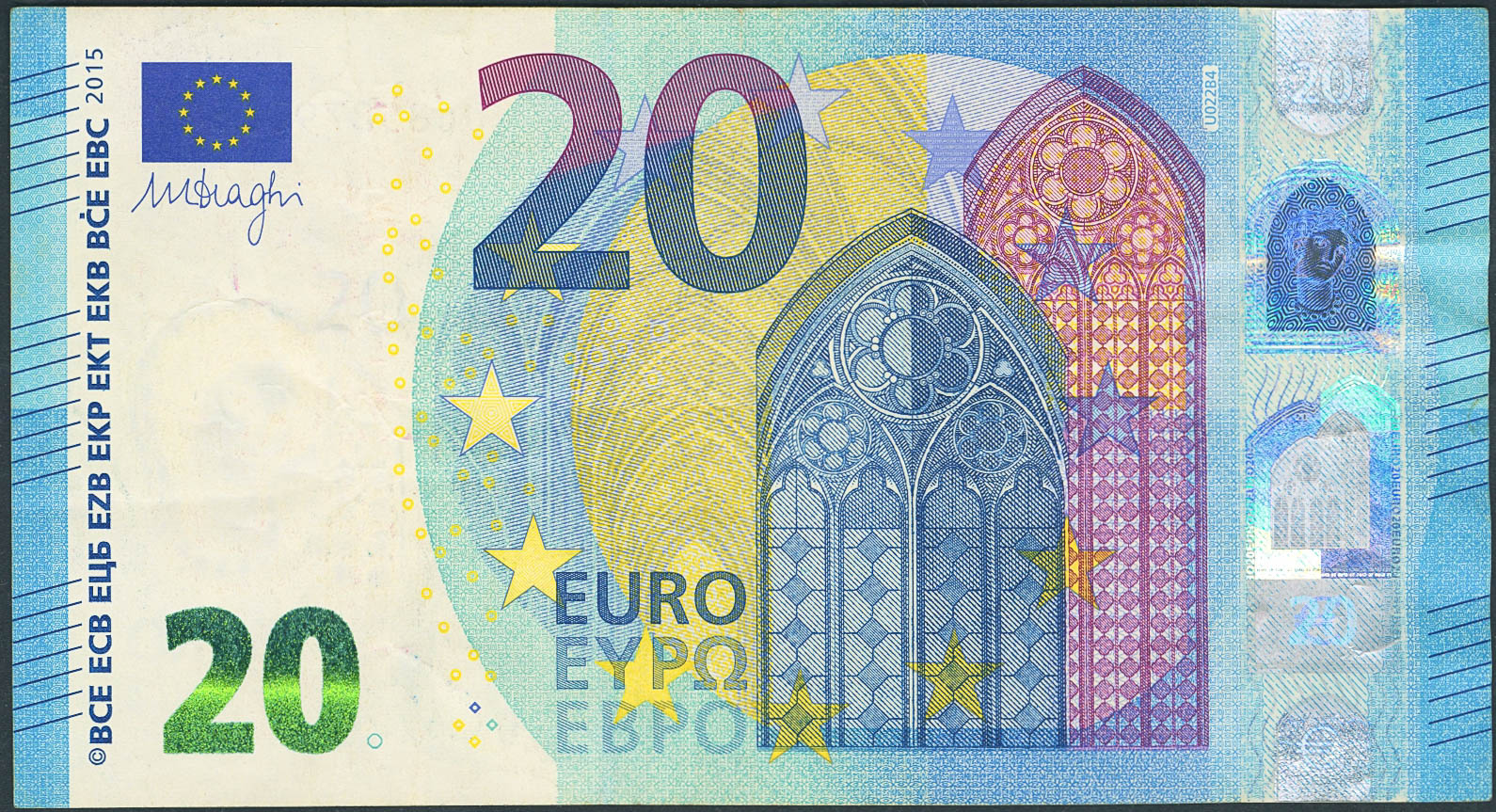 FRANCE. 20 Euros. 2015. No security printing on the reverse. Signature Draghi. Serial U (France) (Pick: 22u). Less than Very Fine.