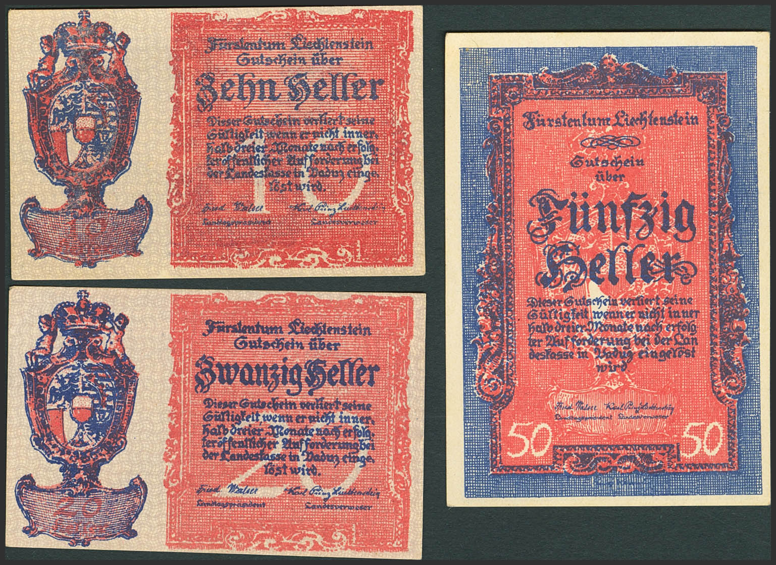 LIECHTENSTEIN-NOTGELD. 10 Heller, 20 Heller and 50 Heller. 1920. (Pick: 1, 2, 3). Uncirculated.