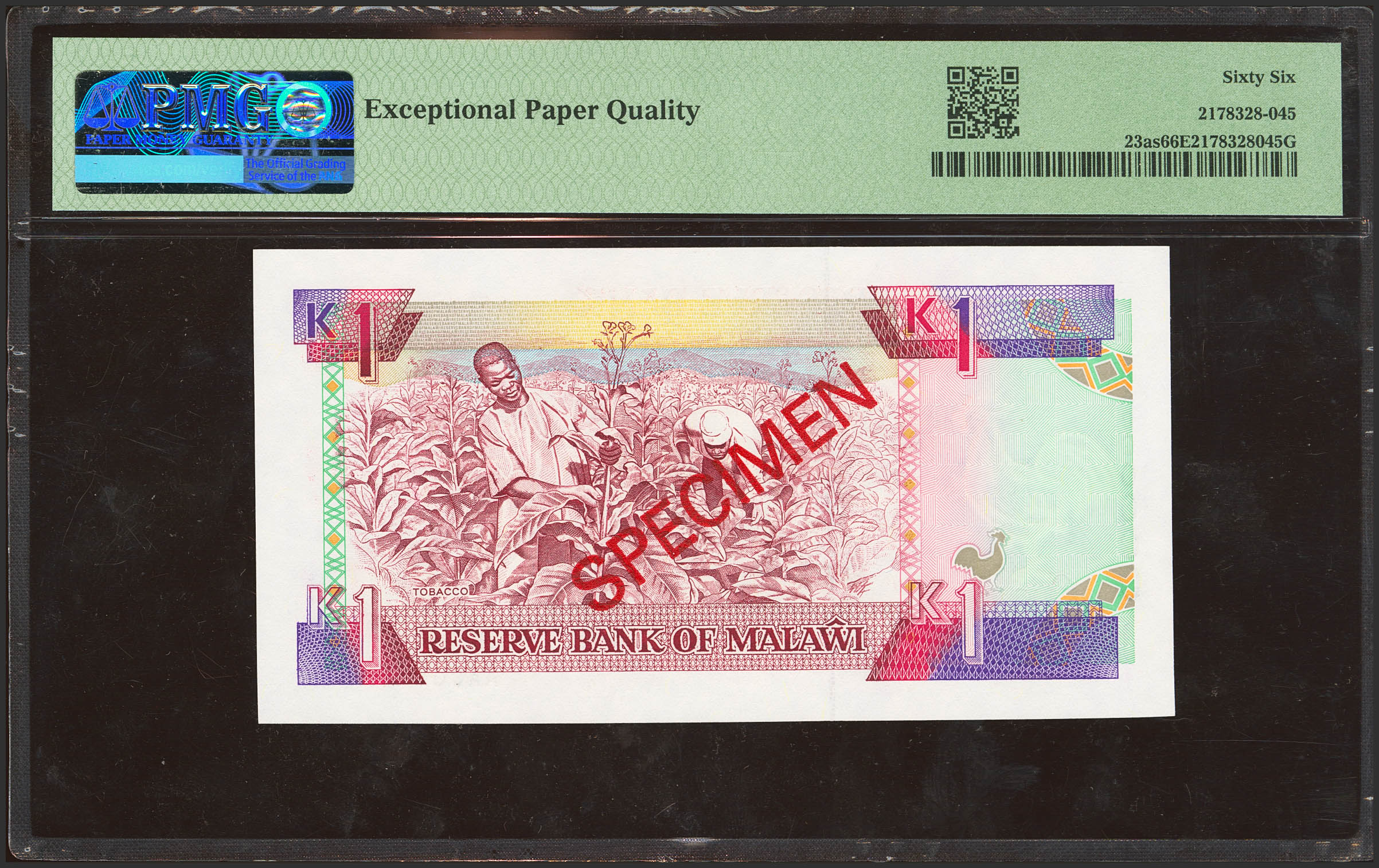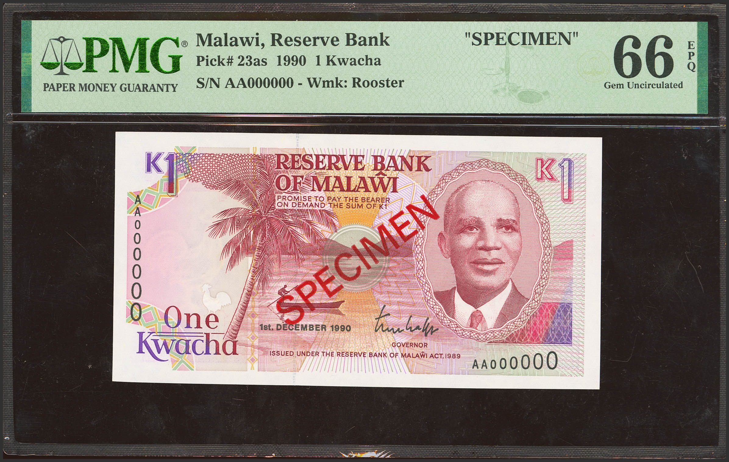 MALAWI. 1 Kwacha. 1990. SPECIMEN and numeration AA000000. (Pick: 23as). PMG66EPQ (according to the PMG population report, it is the Top Pop banknote as of 15 January 2025).
