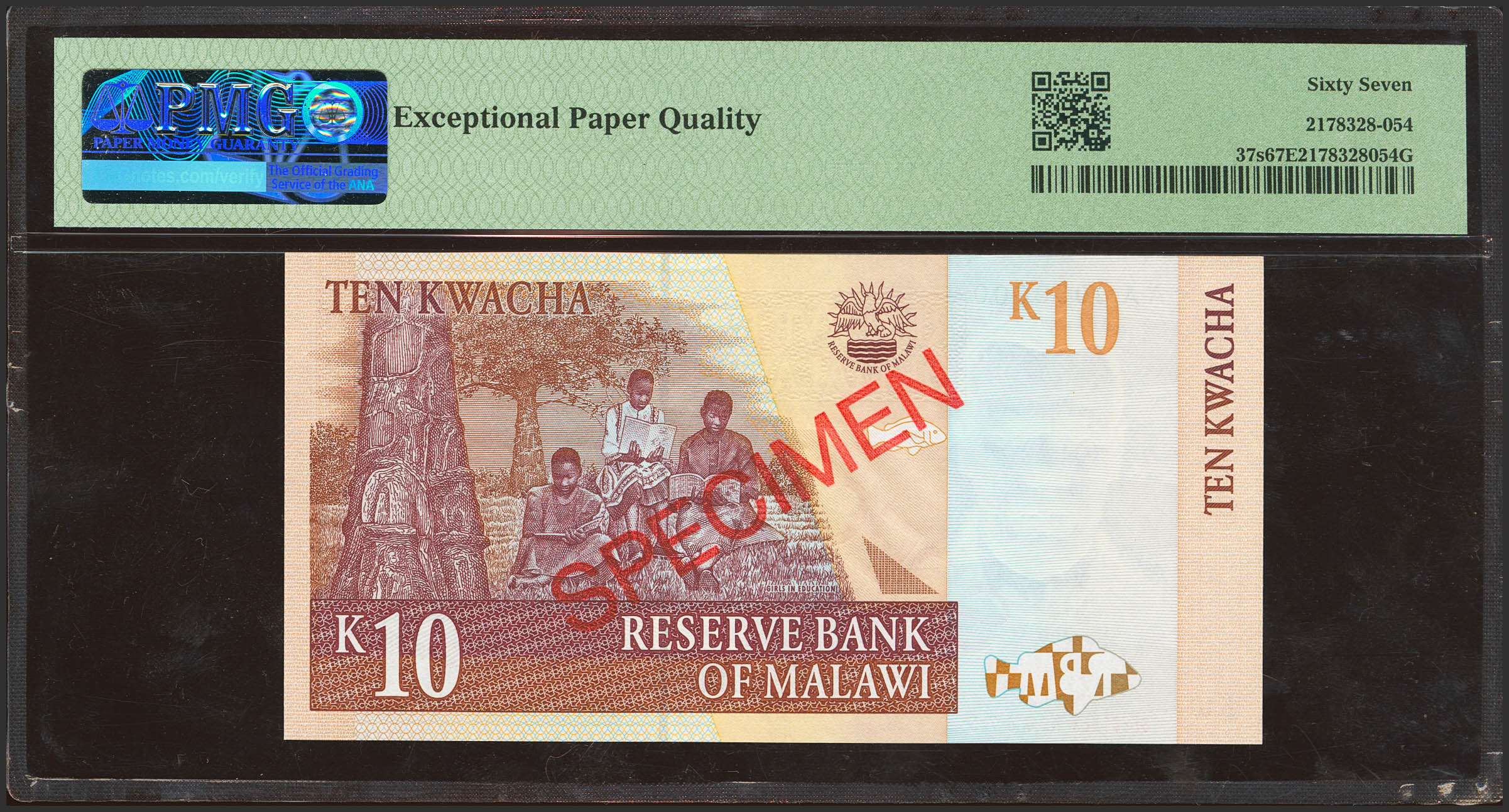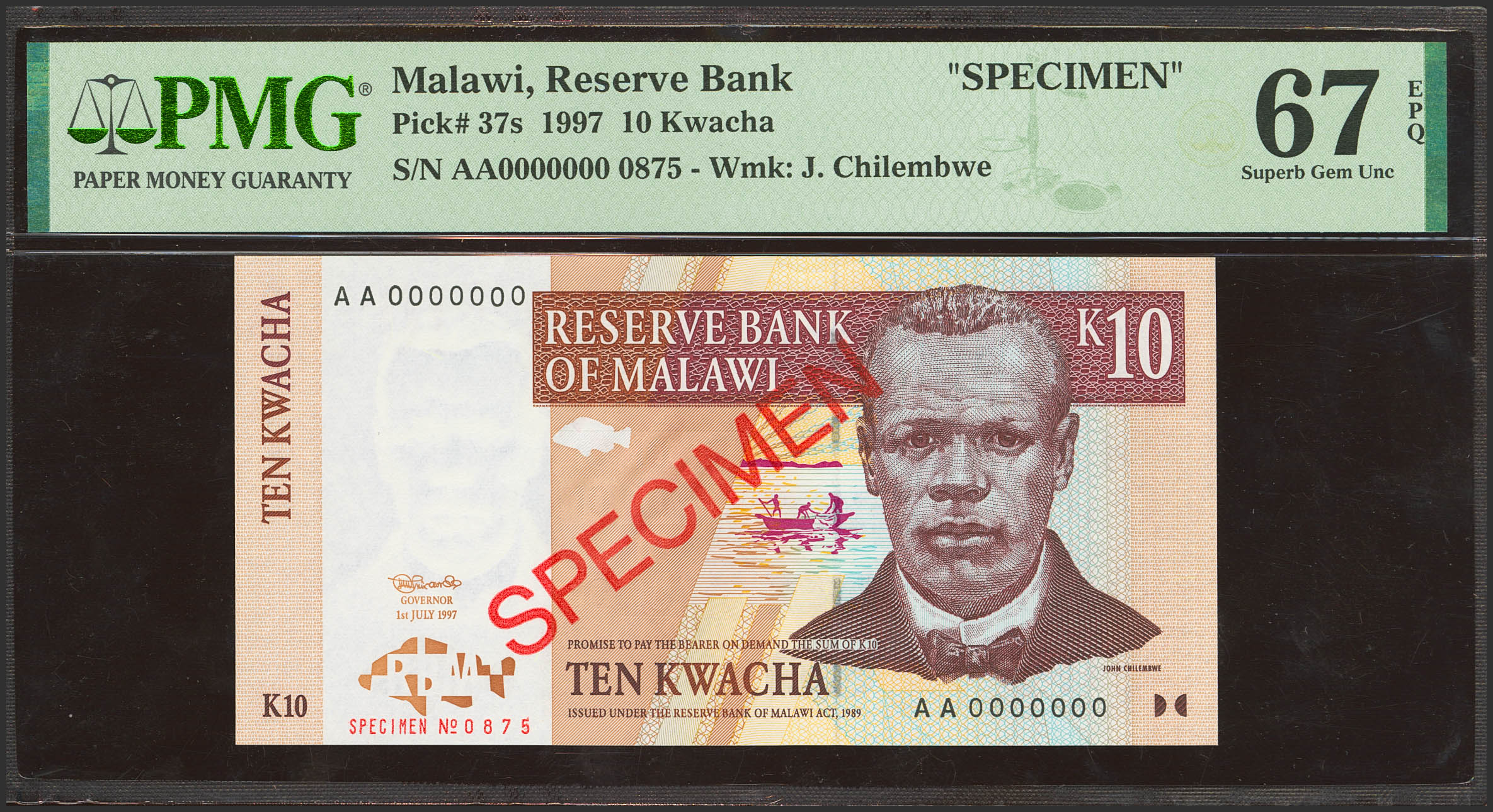 MALAWI. 10 Kwacha. 1997. SPECIMEN and numeration AA000000. (Pick: 37s). PMG67EPQ (according to the PMG population report, it is the Top Pop banknote as of 15 January 2025).