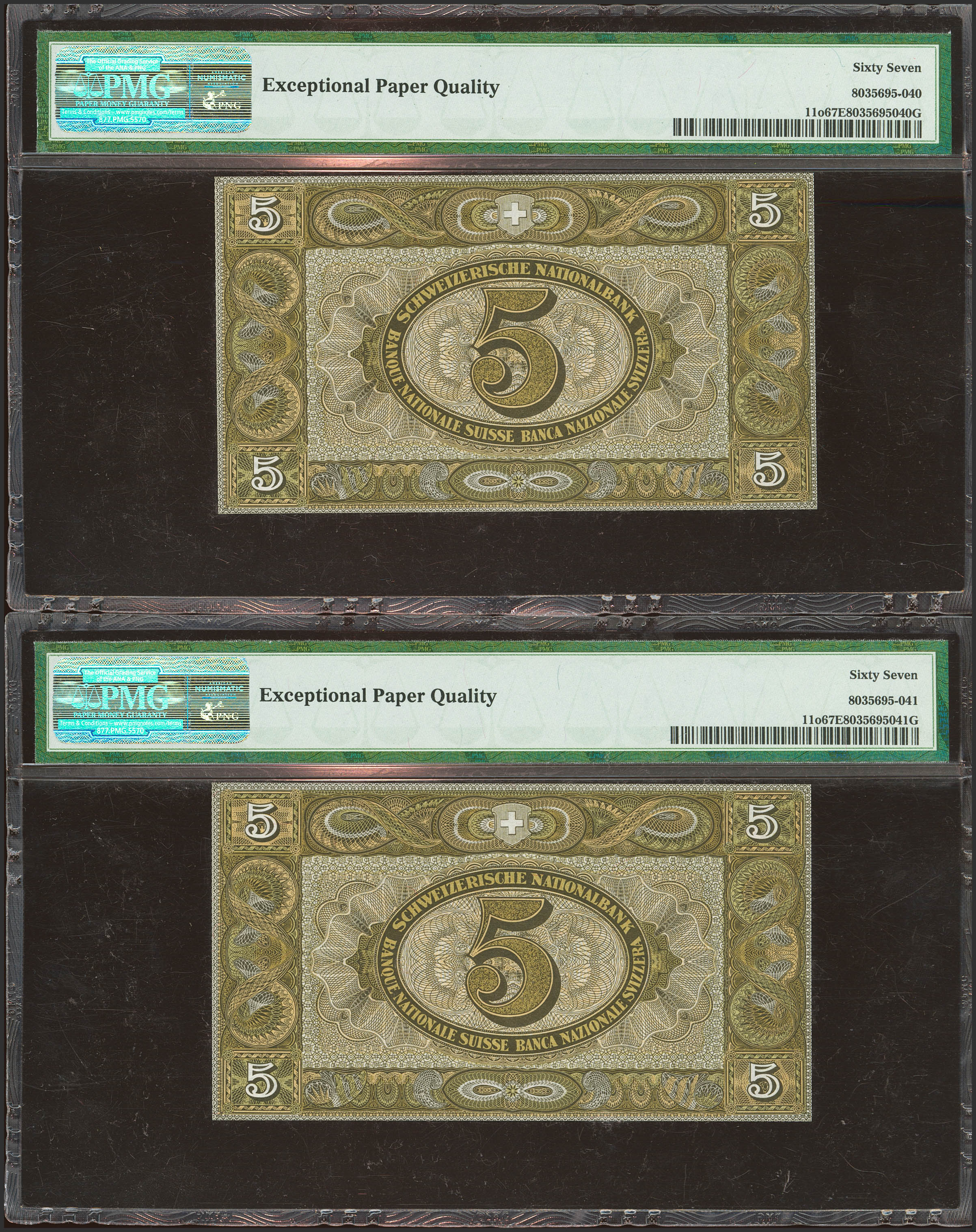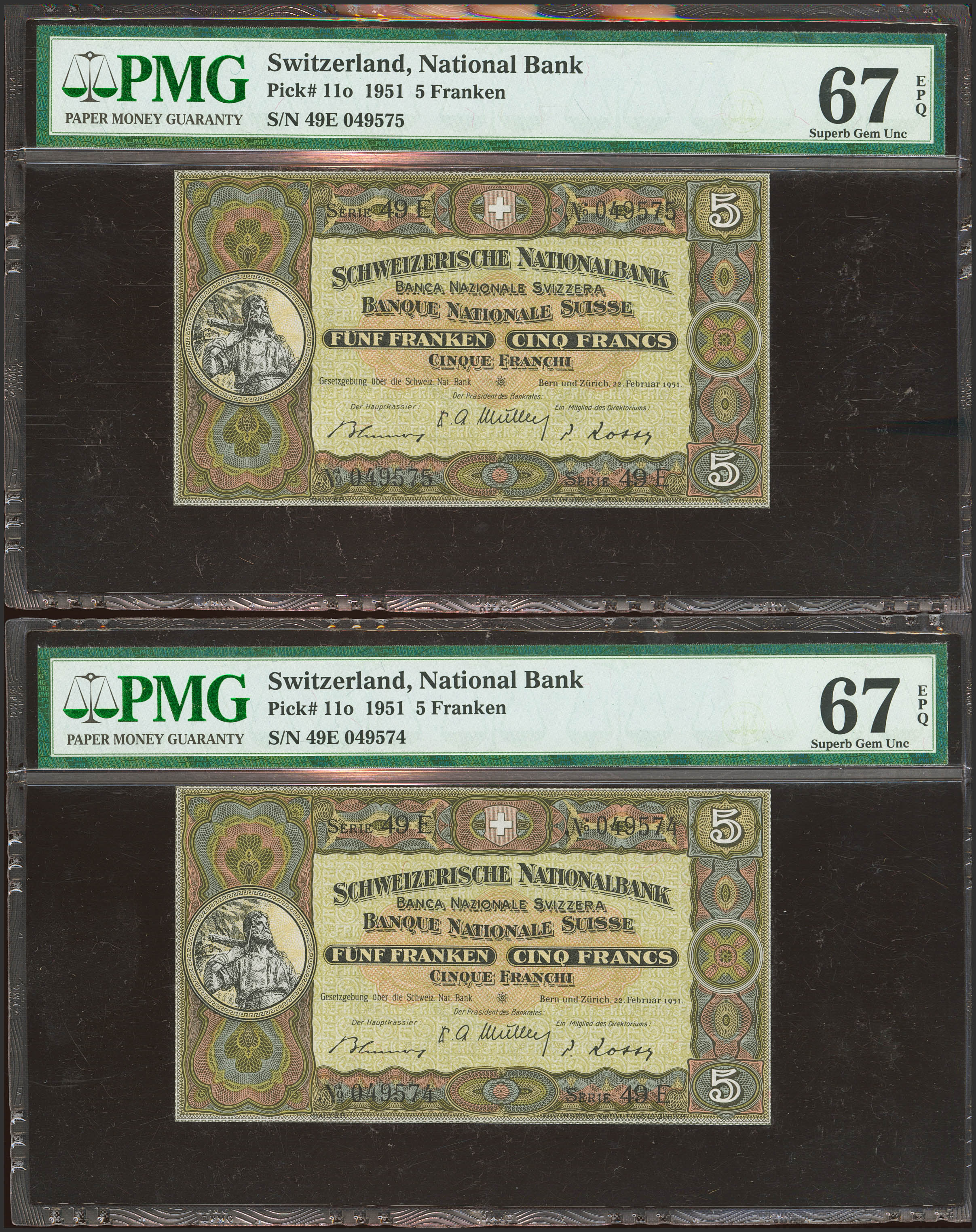 SWITZERLAND. 5 Franken. Correlative pair. 1951. (Pick: 11o). PMG67EPQ, both.