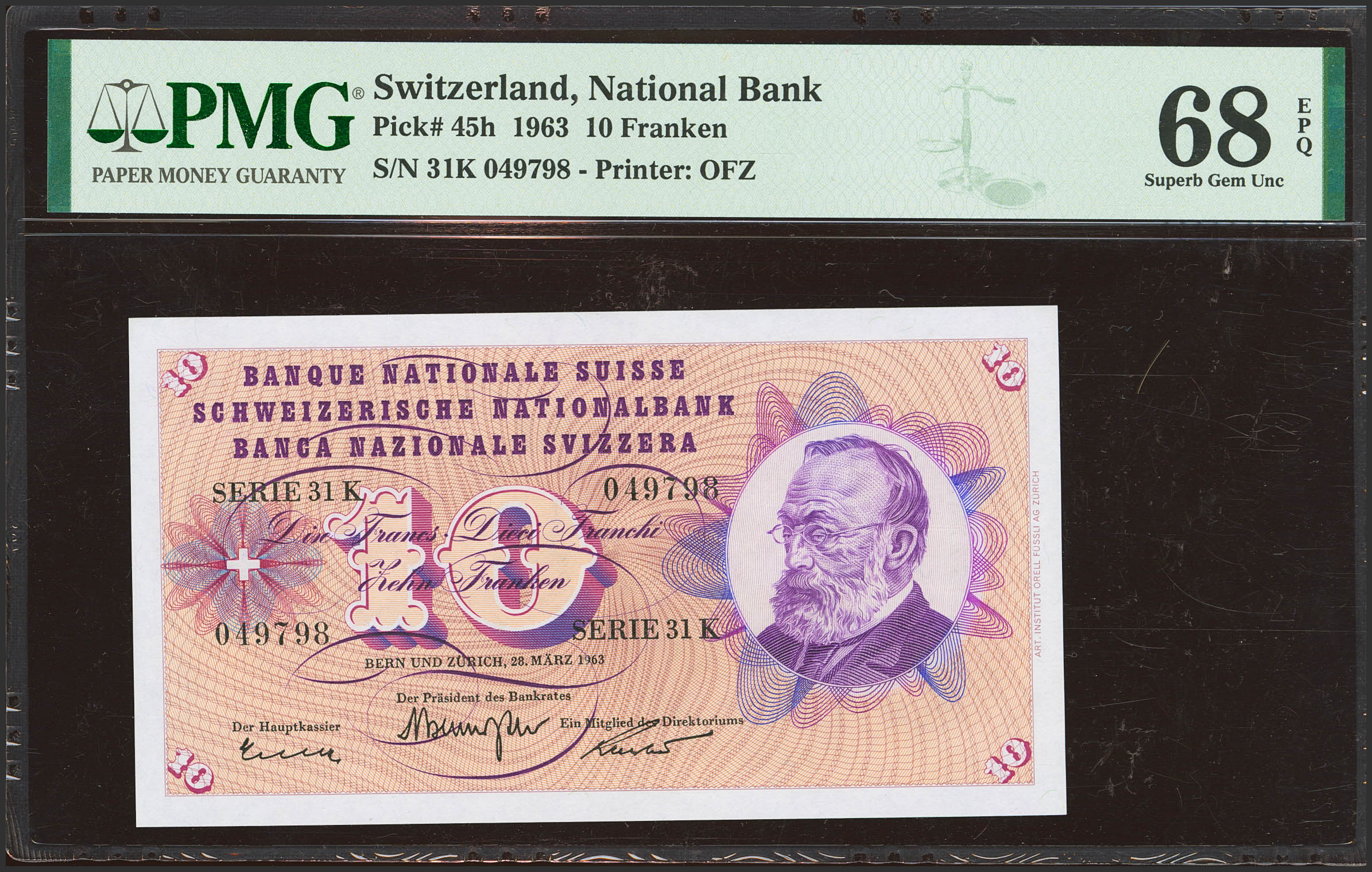 SWITZERLAND. 10 Franken. 28 March 1963. (Pick: 45h). PMG68EPQ.