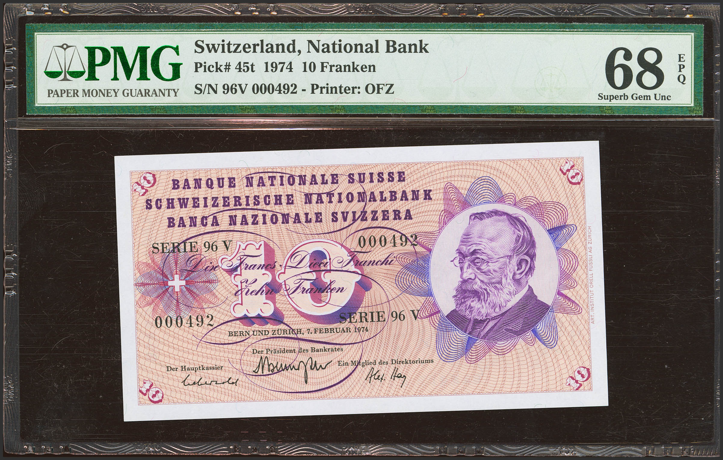 SWITZERLAND. 10 Franken. 7 February 1974. (Pick: 45t). PMG68EPQ.