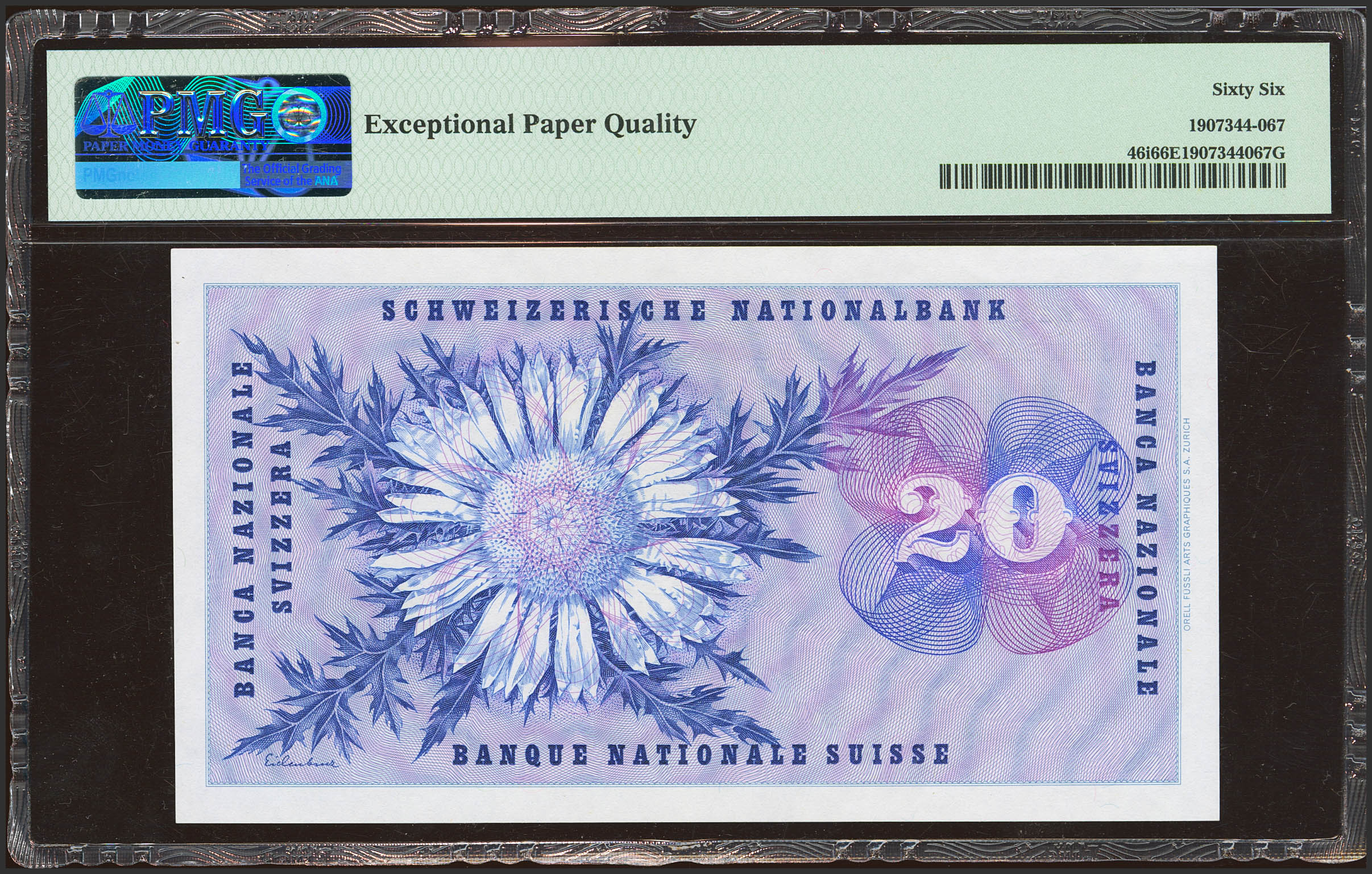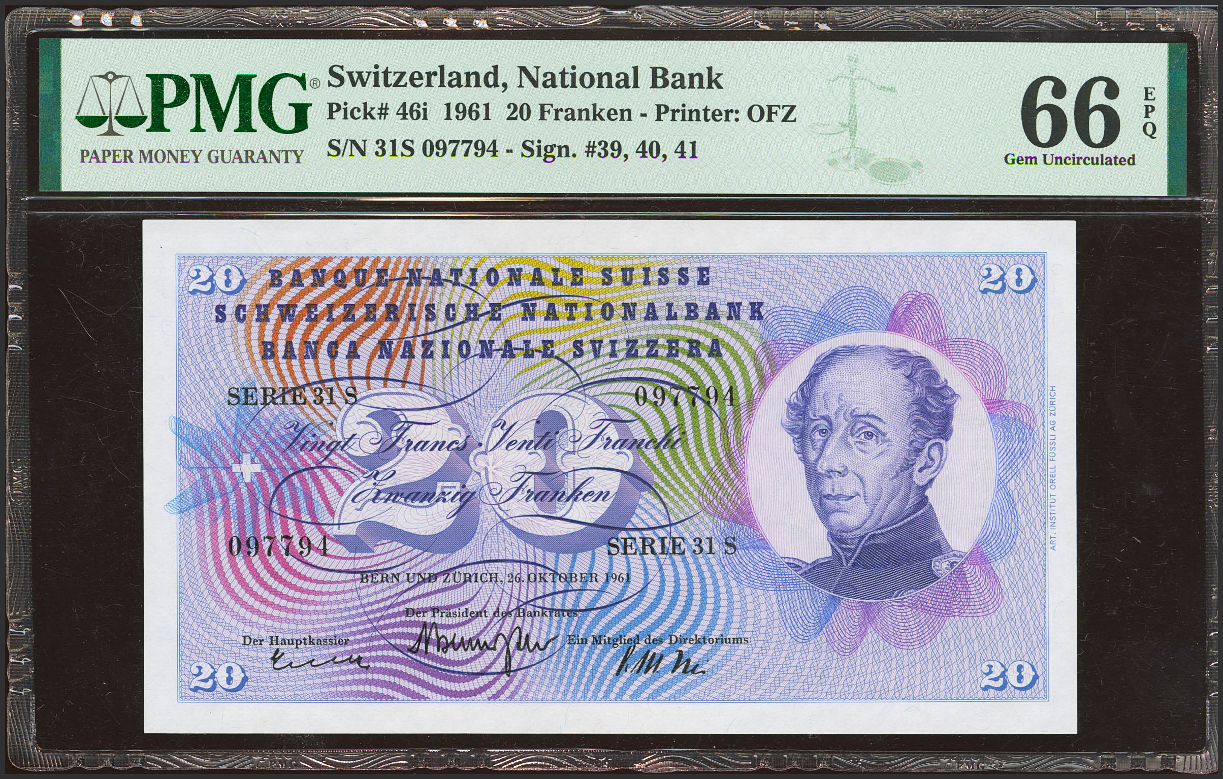 SWITZERLAND. 20 Franken. 26 October 1961. (Pick: 46i). PMG66EPQ.