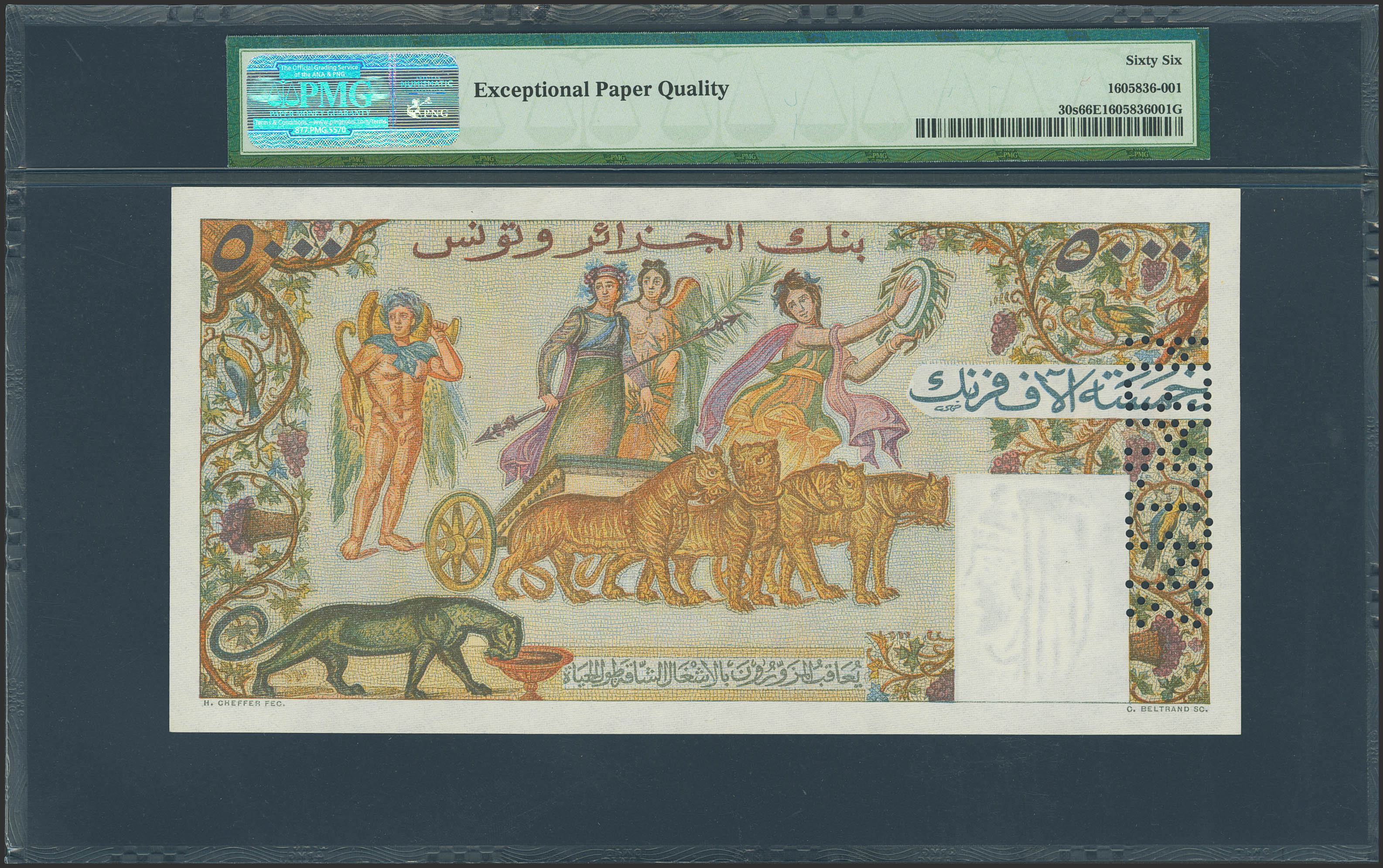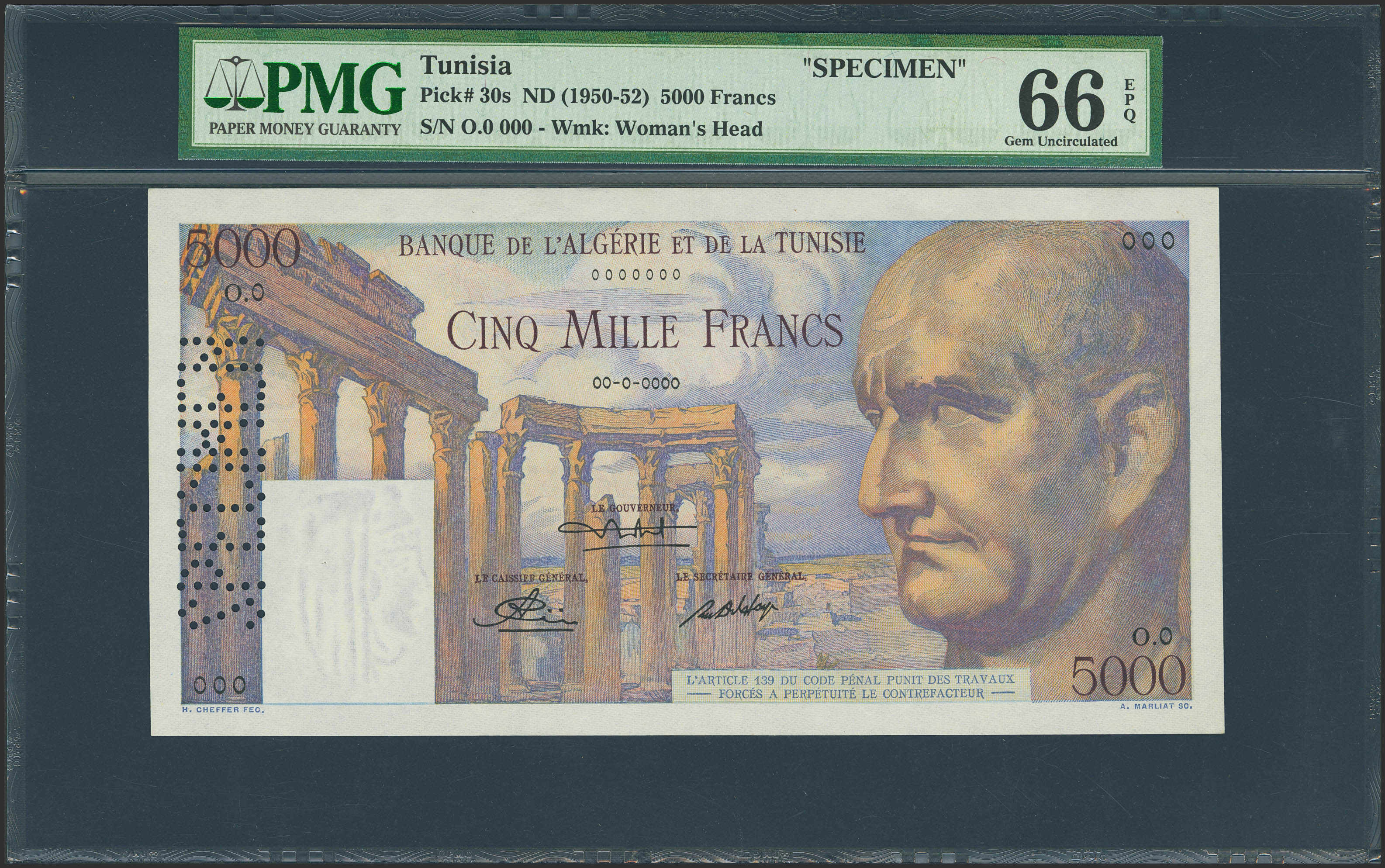 TUNISIA. 5000 Francs. (1950ca). SPECIMEN and numeration 00000. (Pick: 30s). Extremely rare, especially in this incredible and exceptional quality (just for accuarancy we indicate that the banknote has two minimum staple pinholes, only observable to very expert eyes). PMG66EPQ.