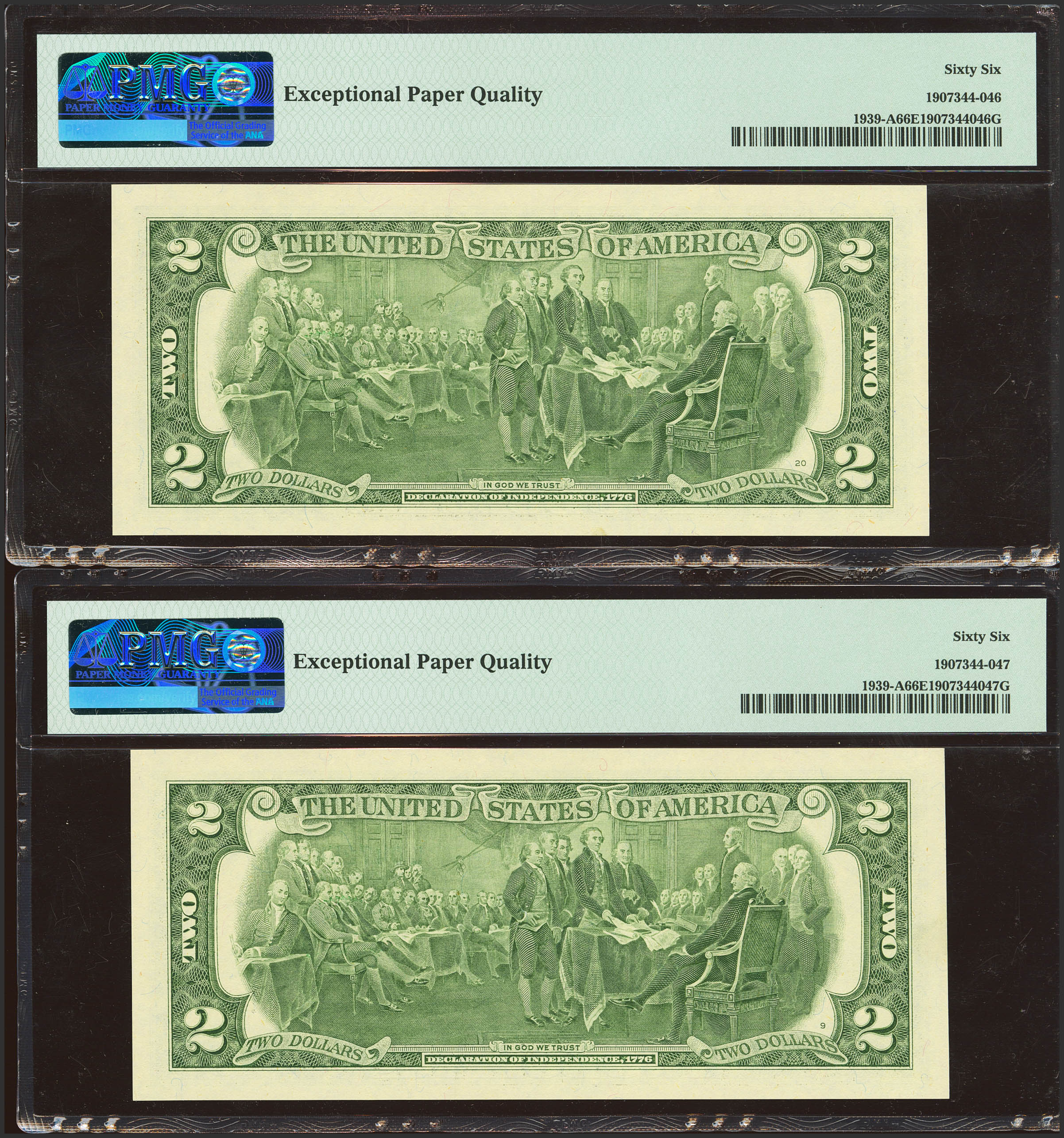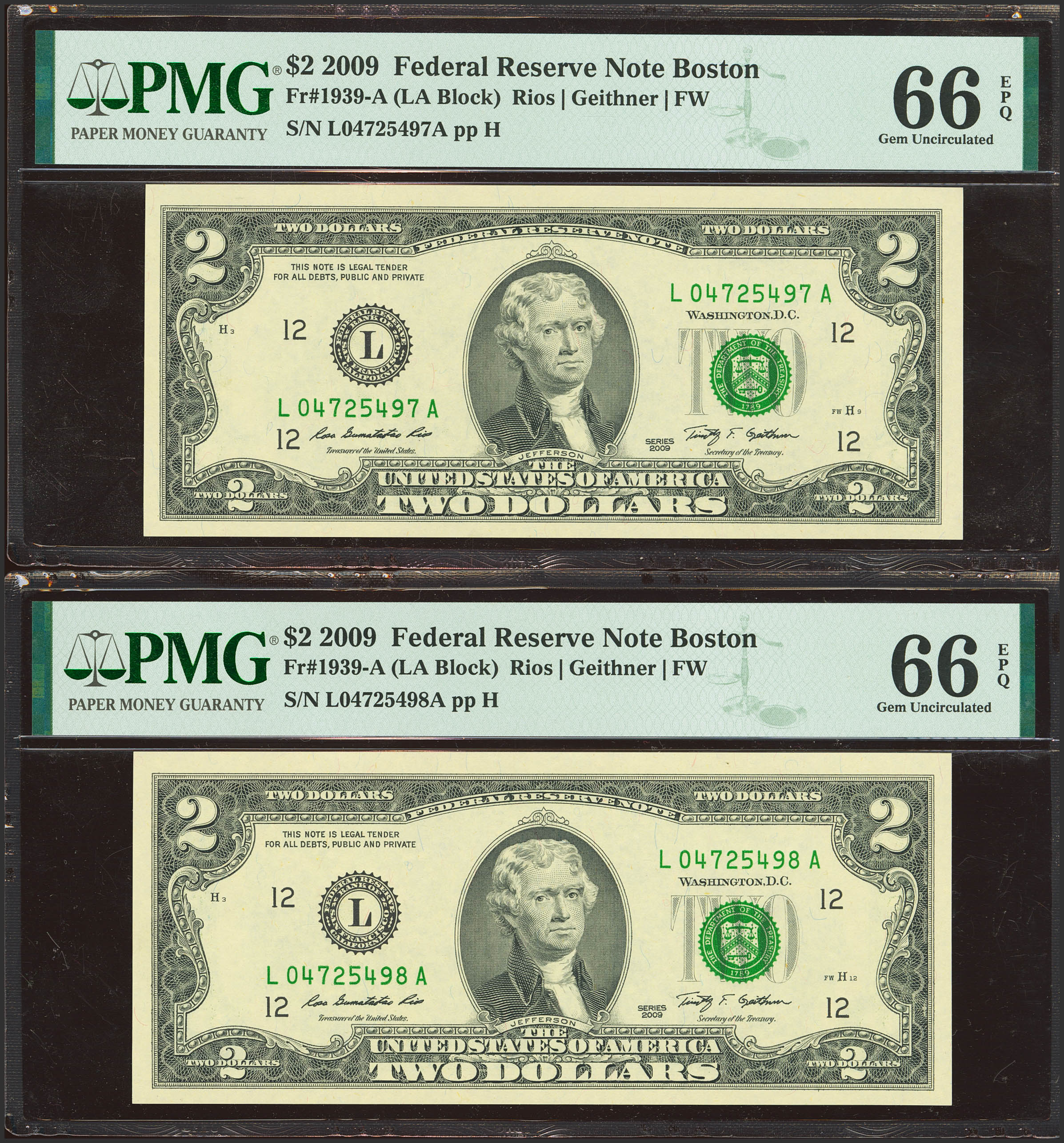 UNITED STATES. 2 Dollars. Correlative pair. 2009. (FR: 1939-A). PMG66EPQ, both.