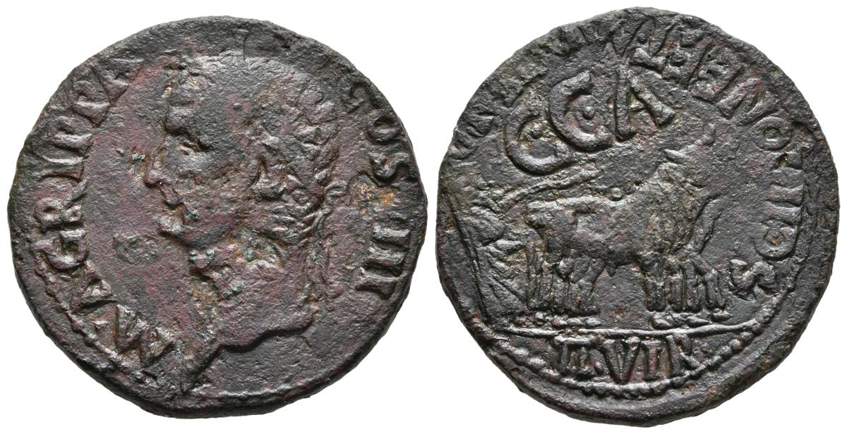 CAESARAUGUSTA. As. Epoca de Calígula. 37-41 a.C. Zaragoza. A/ Cabeza laureada de Agrippa a izquierda, leyenda interna M. AGRIPPA L. F. COS. III. R/ Yunta de bueyes a derecha, debajo II·VIR, encima C·C·A. y alrededor SCIPIONE. ET. MONTANO. FAB-386. Ae.12,74g. MBC-.