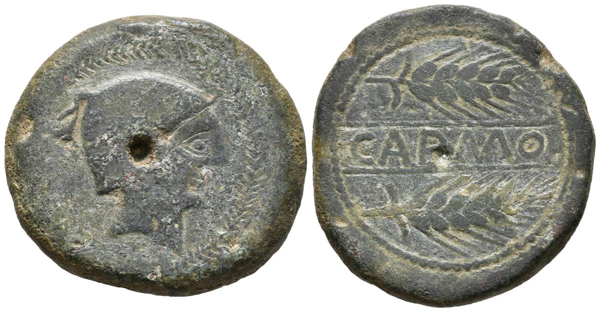 CARMO. As. 80 a.C. Carmona (Sevilla) A/ Cabeza masculina a derecha, con casco dentro de láurea. R/ CARMO entre dos espigas a derecha. FAB-454. Ae. 25,28g. Intento de perforación. MBC/MBC+.