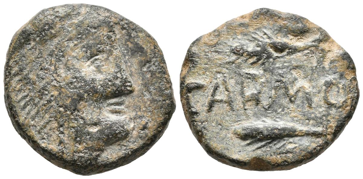 CARMO. As. 80 a.C. Carmona (Sevilla) A/ Cabeza de Hércules a derecha. R/ Dos espigas a derecha, entre ambas CARMO. FAB-466 como semis. Ae. 17,79g. MBC-/MBC.
