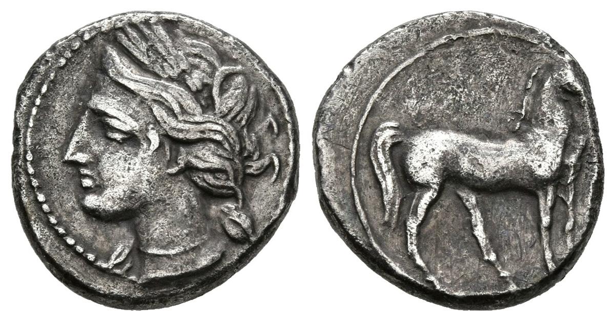 ZEUGITANIA. 1/4 Shekel. 220-205 a.C. Carthago. A/ Cabeza de Tanit a izquierda. R/ Caballo parado a derecha. SNG Copenhagen 335. Ar. 1,79g. MBC+.