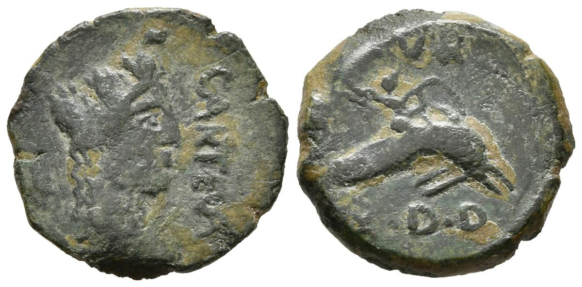 CARTEIA. Semis. Epoca de Augusto. 27 a.C.-14 d.C. San Roque (Cadiz). A/ Cabeza femenina con corona mural a derecha, delante CARTEIA y detrás tridente. R/ Amorcillo sobre delfín a derecha, encima IIII VIR, debajo EX DD. FAB-670. Ae. 4,15g. MBC-.