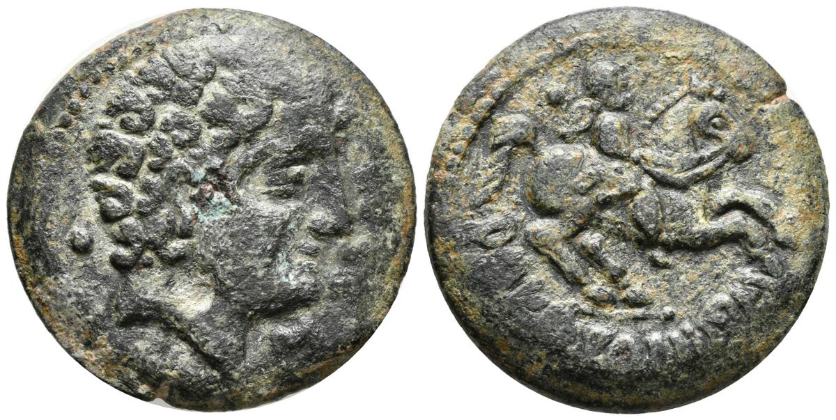 AREICORATICOS. As. 150-20 a.C. Agreda (Soria). A/ Cabeza masculina a derecha, delante letras ibéricas SOS, detrás punto. R/ Jinete con clámide a derecha, detrás punto, debajo leyenda ibérica CoS. FAB-84. Ae. 22,90g. Buen ejemplar para esta ceca. MBC+. Muy escasa.