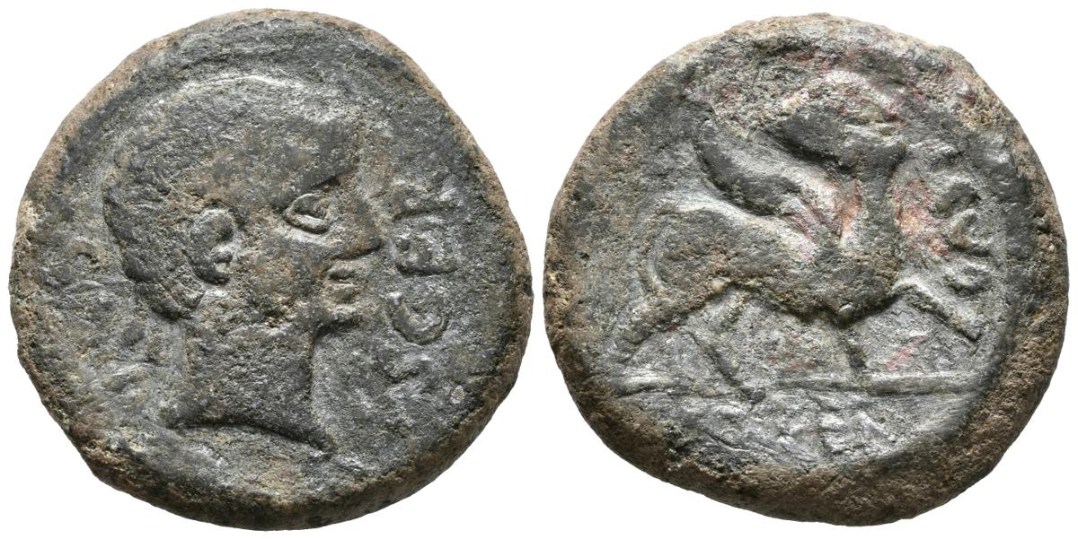 CASTULO. As. 180 a.C. Cazlona (Jaén) A/ Cabeza masculina laureada a derecha, alrededor SACAL-ISCER. R/ Esfinge a derecha, delante CAST y en exergo SOCED. FAB-709. Ae. 19,57g. MBC-.