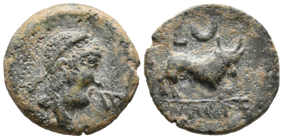 CASTULO. Semis. 180 a.C. Cazlona (Jaén). A/ Cabeza masculina diademada a derecha, delante letra ibérica Ca. R/ Toro a derecha, encima L y creciente, debajo leyenda. FAB-722. Ae. 4,83g MBC.