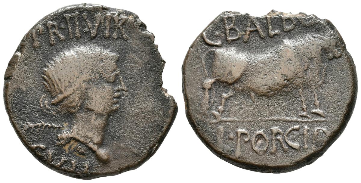 CELSA. As. 50-30 a.C. Velilla de Ebro (Zaragoza) A/ Busto femenino a derecha con ligero drapeado y palma, encima PR·II.VIR, debajo C·V·I·L. R/ Toro parado a derecha, encima C·BALBO, debajo L·PORCIO. FAB-800. Ae. 12,65g. MBC-.