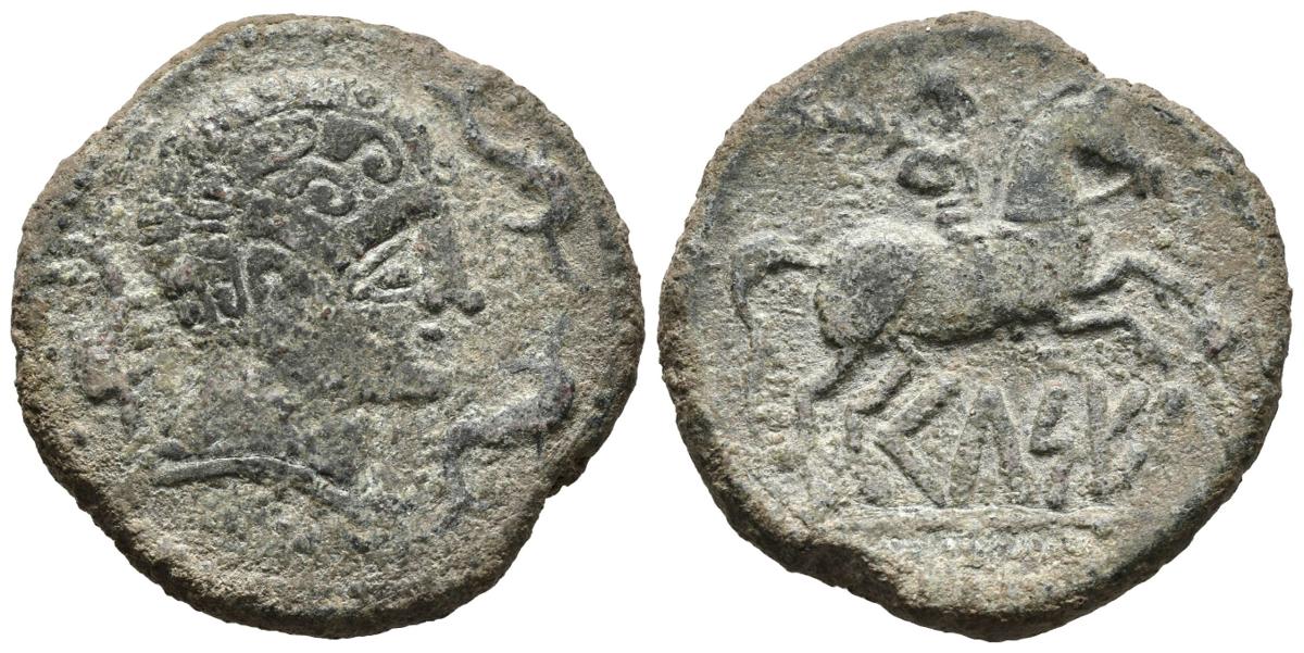 CELSE. As. 120-50 a.C. Velilla del Ebro (Zaragoza). A/ Cabeza masculina a derecha con manto y fíbula, alrededor de tres delfines. R/ Jinete con palma a derecha debajo CeLSE. FAB-771var. Ae. 14,74g. Variante de arte en el peinado. MBC+.