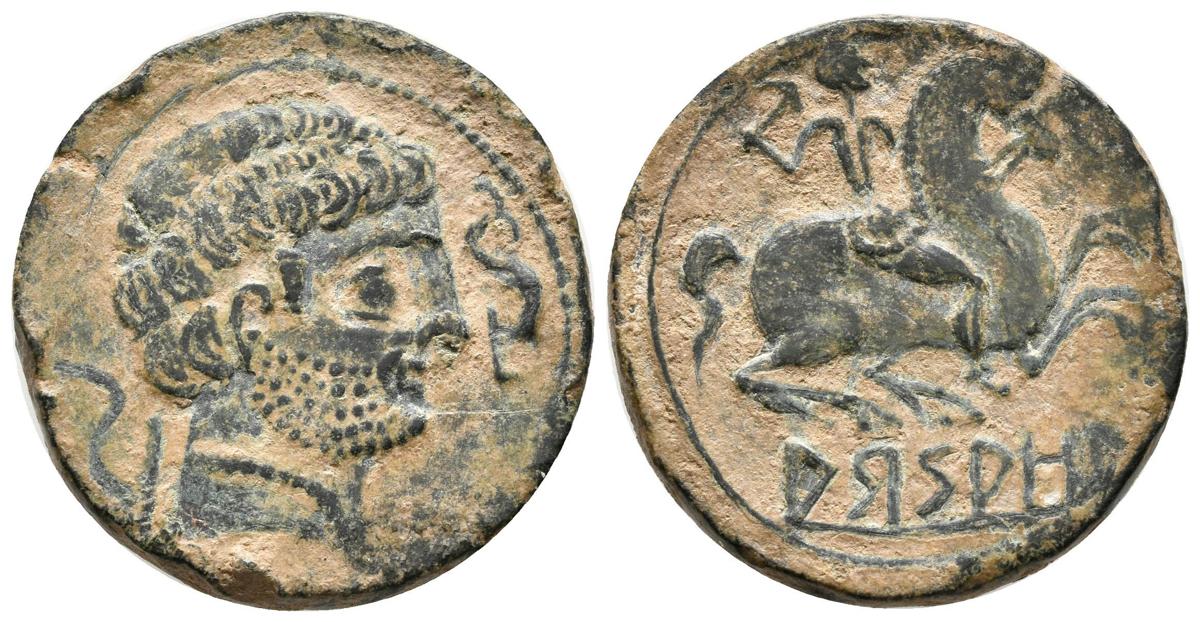 ARSAOS. As. 120-80 a.C. Jaca (Huesca). A/ Cabeza masculina a derecha entre arado y delfín. R/ Jinete con dardo a derecha, debajo ARSAOS. FAB-144. Ae. 9,96g. MBC+.