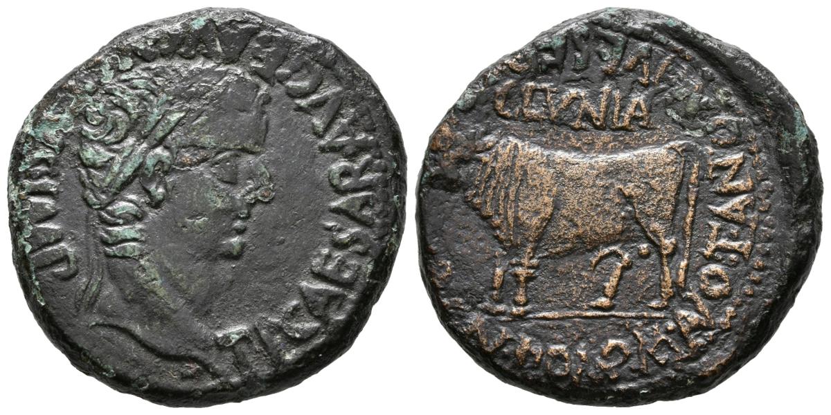 CLUNIA. As. Epoca de Tiberio. 14-36 a.C. Coruña del Conde (Burgos). A/ Cabeza de Tiberio a derecha. TI CAESAR AVG F AVGVSTVS IMP. R/ Toro a izquierda, sobre él CLVNIA, alrededor leyenda externa CN PONP M ANOT T ANTON M IVL SERAN III VIR. FAB-836. Ae. 13,59g. MBC+/MBC.