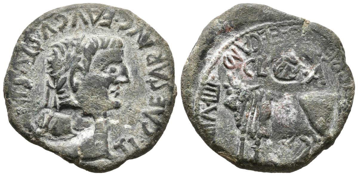 CLUNIA. As. Epoca de Tiberio. 14-36 a.C. Coruña del Conde (Burgos). A/ Cabeza de Tiberio a derecha. TI CAESAR AVG F AVGVSTVS IMP. R/ Toro a izquierda, sobre él CLVNIA, alrededor leyenda externa C AEM METO T COR MATE L CAEL PRES C CAEL CA IIII VIR. FAB-838. Ae. 11,52g. Contramarca de Jabalí acostado en anverso. y cabeza de Jabalí en reverso. MBC+.
