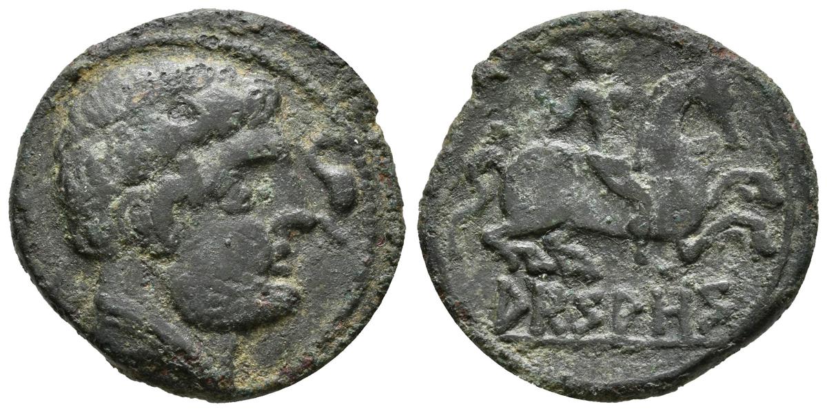 ARSAOS. As. 120-80 a.C. Jaca (Huesca). A/ Cabeza masculina a derecha entre arado y delfín. R/ Jinete con dardo a derecha, debajo ARSAOS. FAB-144. Ae. 7,53g. MBC-/MBC.