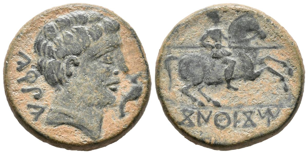 CONTERBIA CARBICA. As. 120-80 a.C. Huete (Cuenca). A/ Cabeza masculina a derecha, delante delfín, detrás CaRBiCa. R/ Jinete con lanza a derecha, debajo CoNTeBaCoM. FAB-846. Ae. 10,25g. Buen ejemplar. MBC+.