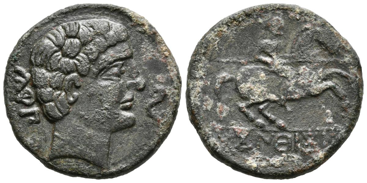 CONTERBIA CARBICA. As. 120-80 a.C. Huete (Cuenca). A/ Cabeza masculina a derecha, delante delfín, detrás CaRBiCa. R/ Jinete con lanza a derecha, debajo CoNTeBaCoM. FAB-846. Ae. 10,38g. EBC-/MBC.