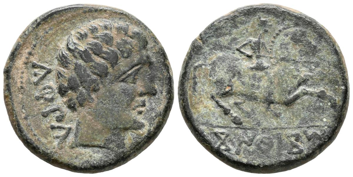 CONTERBIA CARBICA. As. 120-80 a.C. Huete (Cuenca). A/ Cabeza masculina a derecha, delante delfín, detrás CaRBiCa. R/ Jinete con lanza a derecha, debajo CoNTeBaCoM. FAB-846. Ae. 10,68g. MBC+/MBC-.