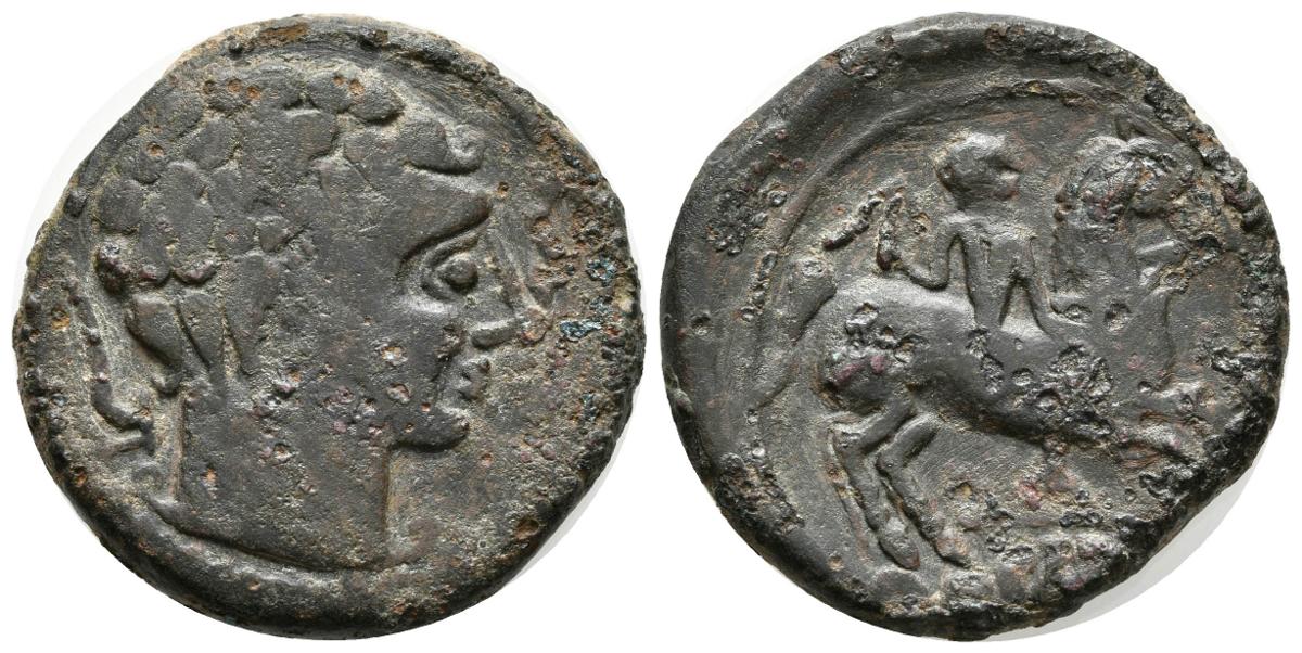 ARSAOS. As. 120-80 a.C. Jaca (Huesca). A/ Cabeza con barba a derecha, delante delfín y detrás arado. R/ Jinete con dardo a derecha, bajo la línea ARSAOS. FAB-145. Ae. 11,11g. MBC-.