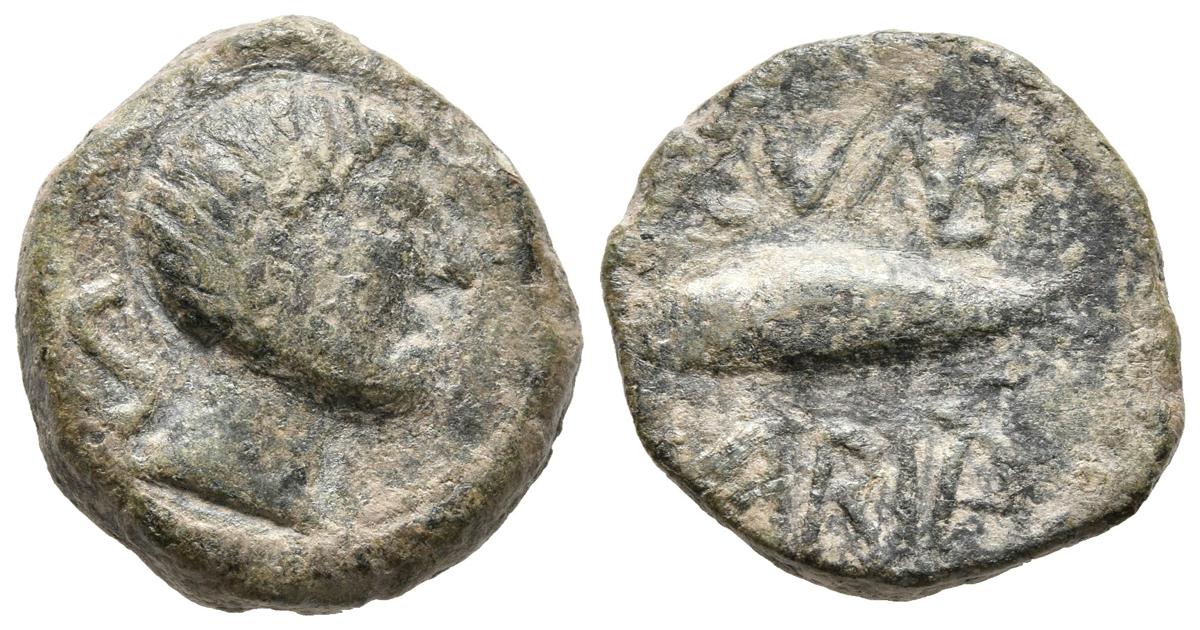 CUNBARIA. Semis. 50 a.C. Las cabezas de San Juan (Sevilla). A/ Cabeza masculina a derecha, detrás S. R/ Atún a izquierda entre CVNB-ARIA. FAB-880. Ae. 6,54g. MBC.