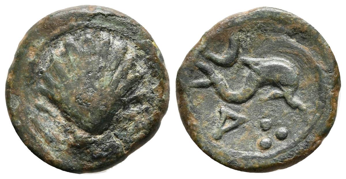 ARSE-SAGUNTO. Cuadrante. 170-20 a.C. Sagunto (Valencia). A/ Concha. R/ Delfín a derecha, encima creciente, debajo letra ibérica A y tres puntos FAB-2054. Ae. 2,77g. BC+/MBC.